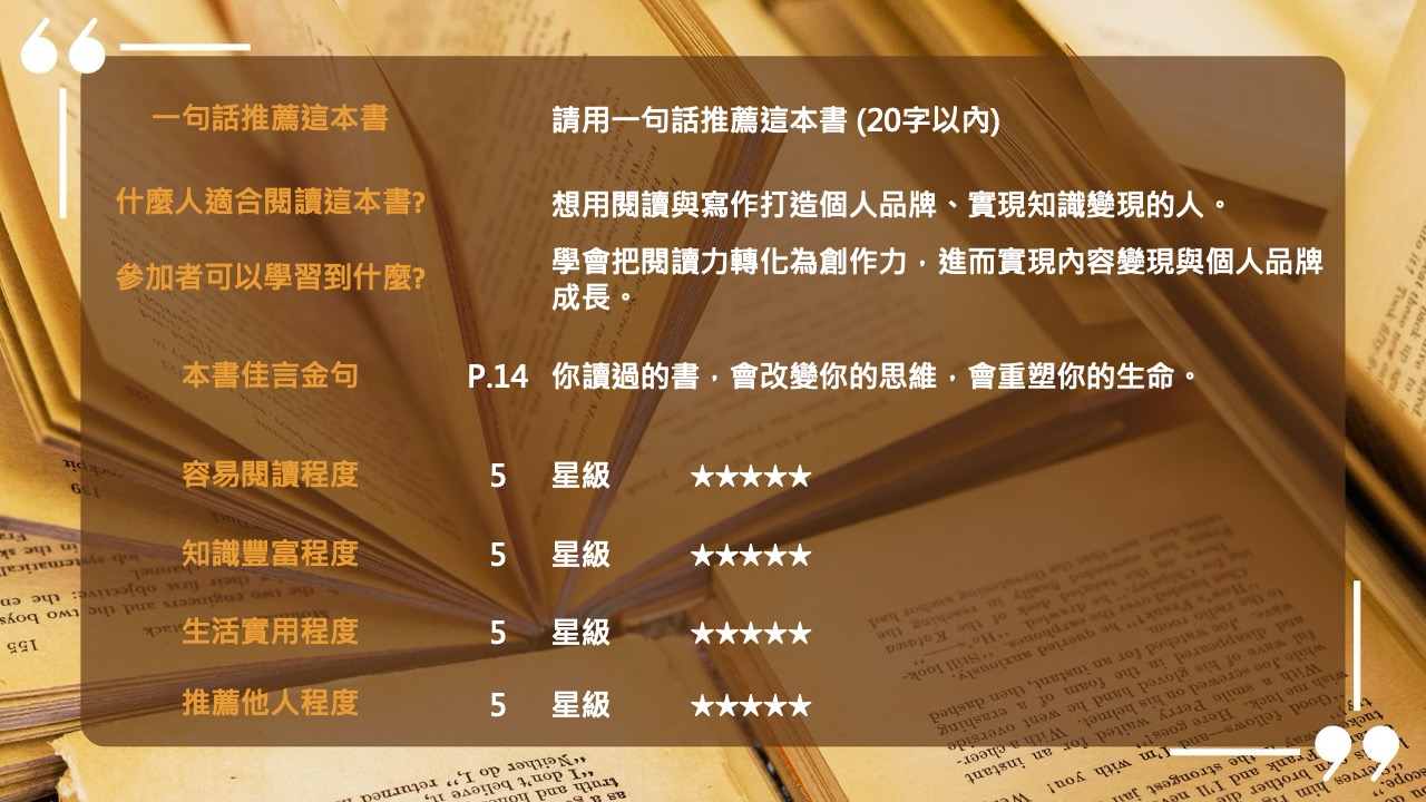 【BookBook預約線上讀書會】讀書變現的創作法則:心得書評、聽書文稿、短影音和直播,新手必學、說書系KOL一定要懂的品牌獲利管道