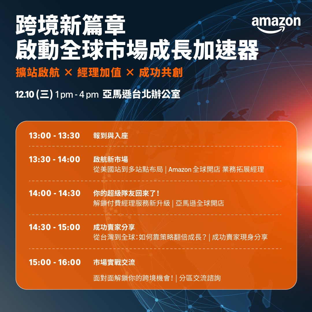 13:30 - 14:00|🌏 啟航新市場:從美國站到多站點布局 | Amazon 全球開店 業務拓展經理