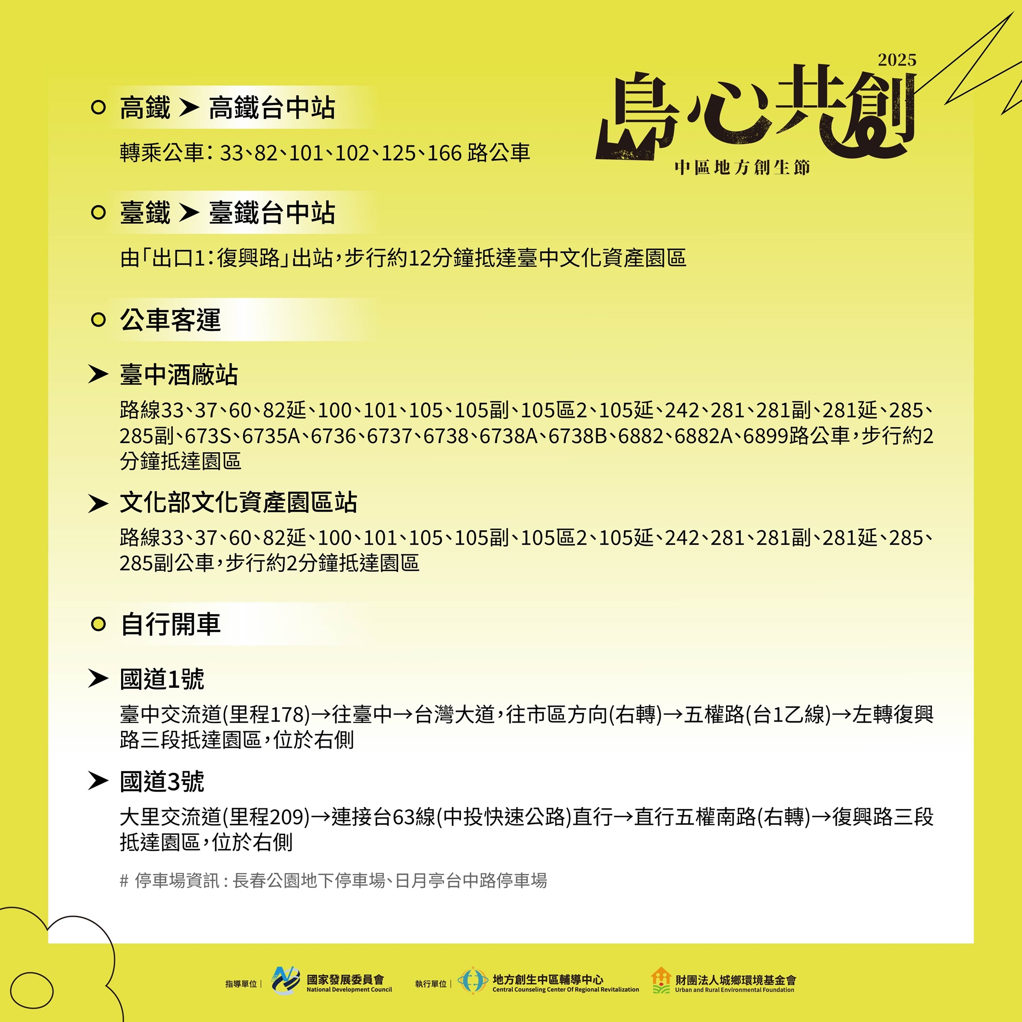 臺中交流道(里程178)▸往臺中▸台灣大道,往市區方向(右轉)▸五權路(台1乙線)▸左轉復興路三段抵達園區,位於右側。
