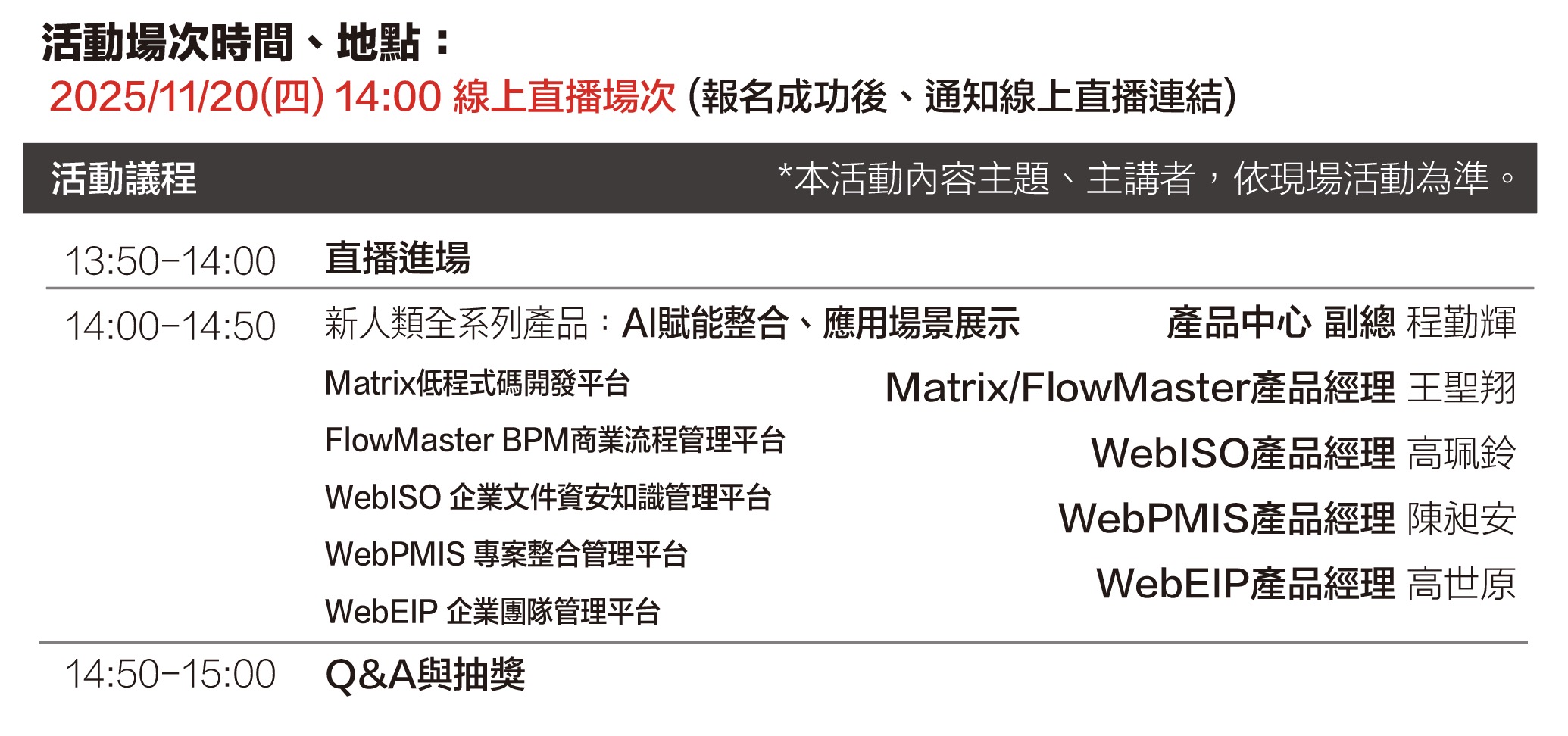 11/20(四)新人類【企業AI人工智慧技術應用】線上安可加場發表會,發表新人類產品全系列AI應用解決方案! 透過新人類豐富的「企業AI應用、數位轉型解決方案」產品群:Matrix企業平台、BPM商業流程、 ISO制度永續、EIP團隊協同、PMIS專案任務管理....一次全面AI賦能!