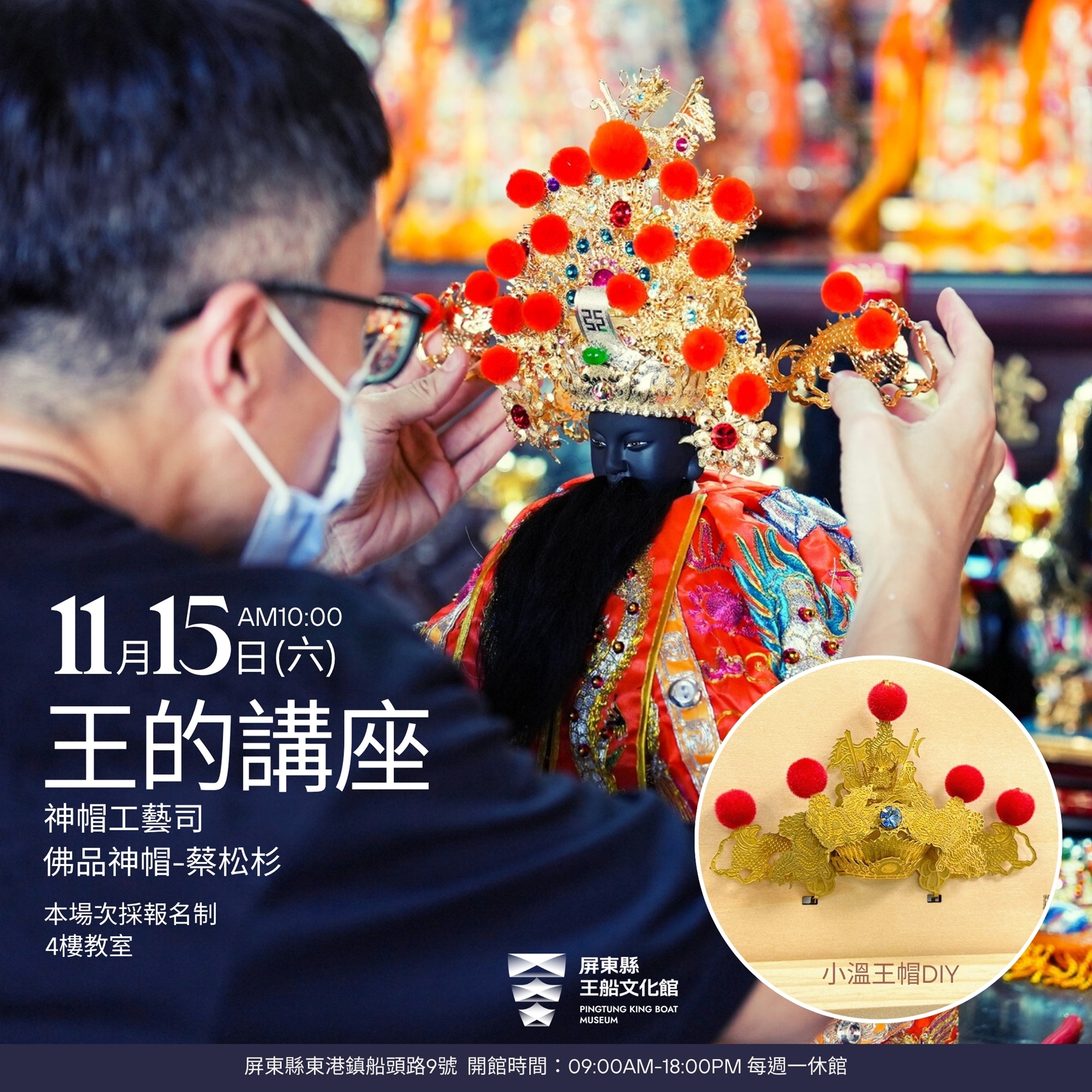 | 【王的講座】-神帽工藝司 佛品神帽-蔡松杉 東港東隆宮溫王爺所配戴的「麒麟帽(溫王帽)」為其身份與威儀象徵的重要標識,造型端肅且具高度辨識性,展現神儀的莊重與沉穩氣度。長期承製溫王帽的「佛品神帽」蔡松杉師傅,本次將透過講座分享神帽的形制特色、工藝技法與製作脈絡,引領大家認識神明冠飾背後所承載的信仰意涵與技藝傳承。 |