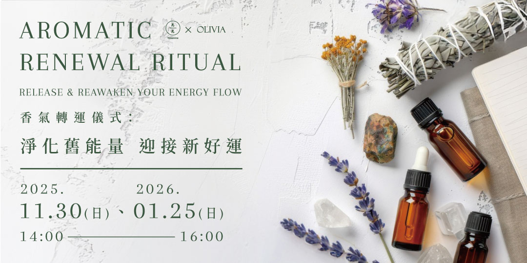 歲末年終之際,是時候再一次與自己好好對話。好的、壞的、未竟的人事物,不知不覺間,這些能量,都影響著我們的身心平衡。透過精油能量與內在覺察,首先具體引導出累積於身心的情緒與部位,關照如何陪伴與釋放這些未竟的能量,並以植物精油、香氣冥想重新對應提升氣場,讓自己從疲憊中回復柔軟。