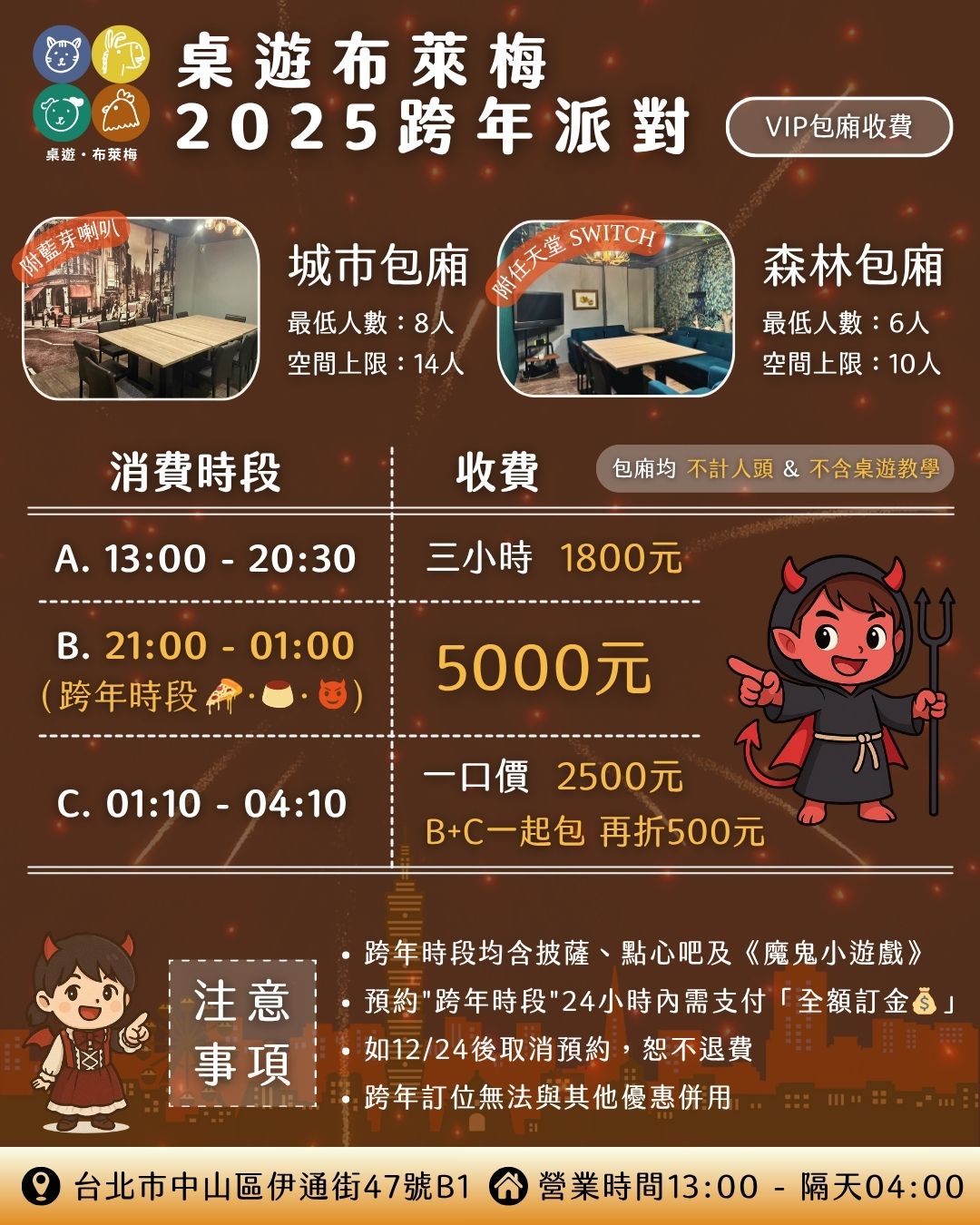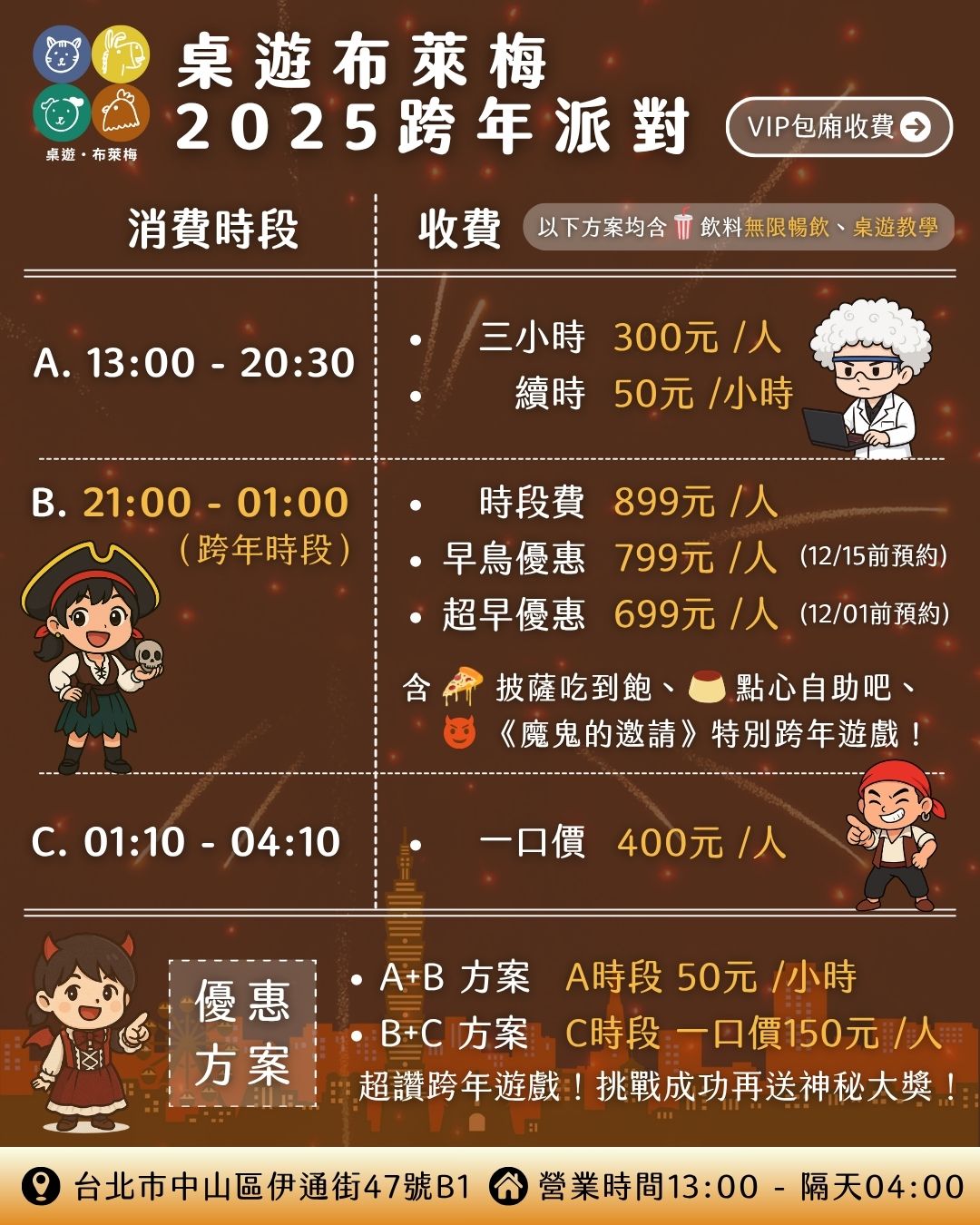 跨年時段:費用都包含⭐比薩‧飲料吃到飽、⭐跨年小遊戲贏桌遊、⭐開盒遊戲任玩