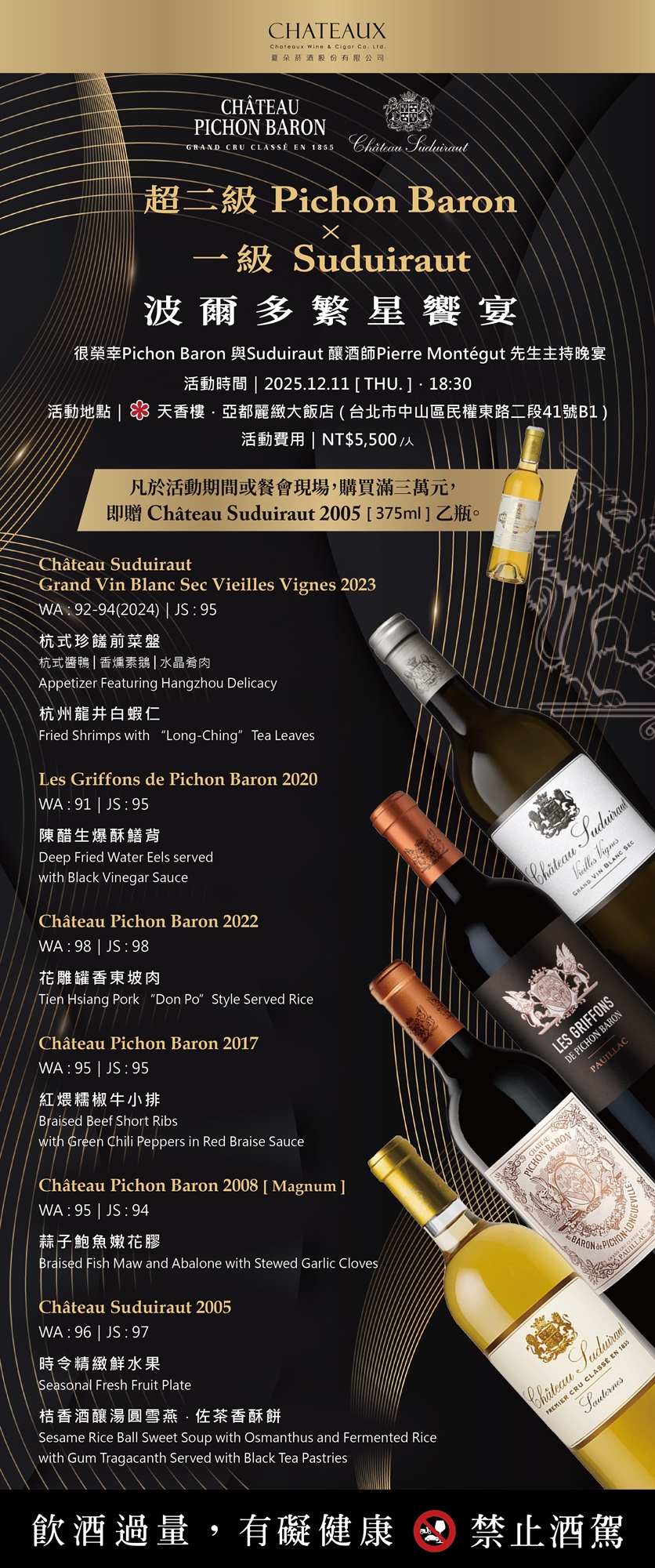 本次品酒會夏朵菸酒非常榮幸地邀請到釀酒師Pierre Montégut先生,帶領大家一同探索Pichon Baron的優雅力量與Suduiraut的華麗甜美。精選酒莊總價值超過$25,000的六款紅白酒,與主廚客製化精心準備的餐點完美搭配。