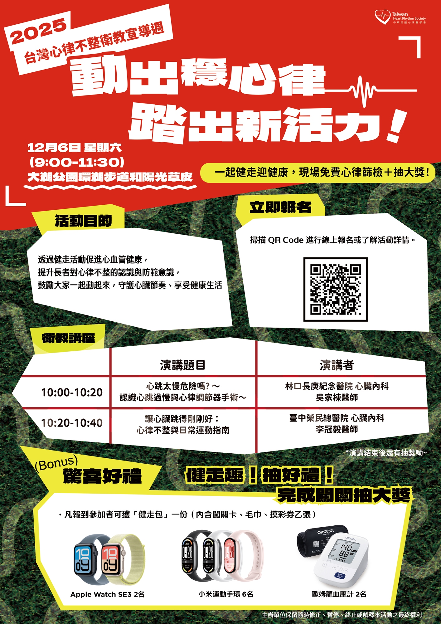 今年度我們在12/6 (六) 將於【大湖公園 - 陽光草皮】舉辦健走活動,邀請長者、家庭與民眾一起健走,以「動出穩心律,踏出新活力」為主題,提升高齡者對心律健康的認識與自我防護意識。