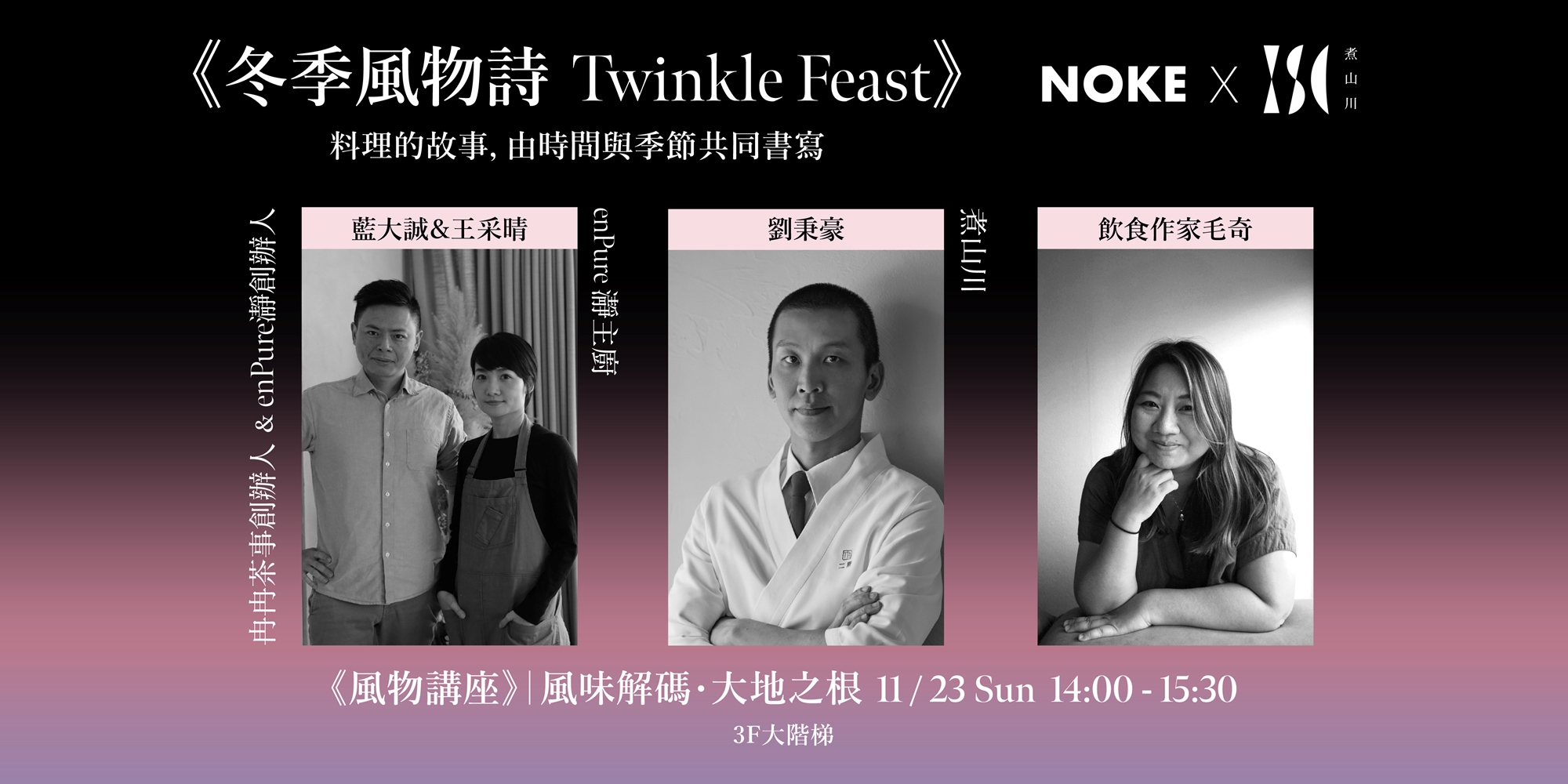 - 與談人:煮山川料理長 劉秉豪、enPure 瀞主廚 王采晴、冉冉茶事創辦人& enPure瀞創辦人 藍大誠