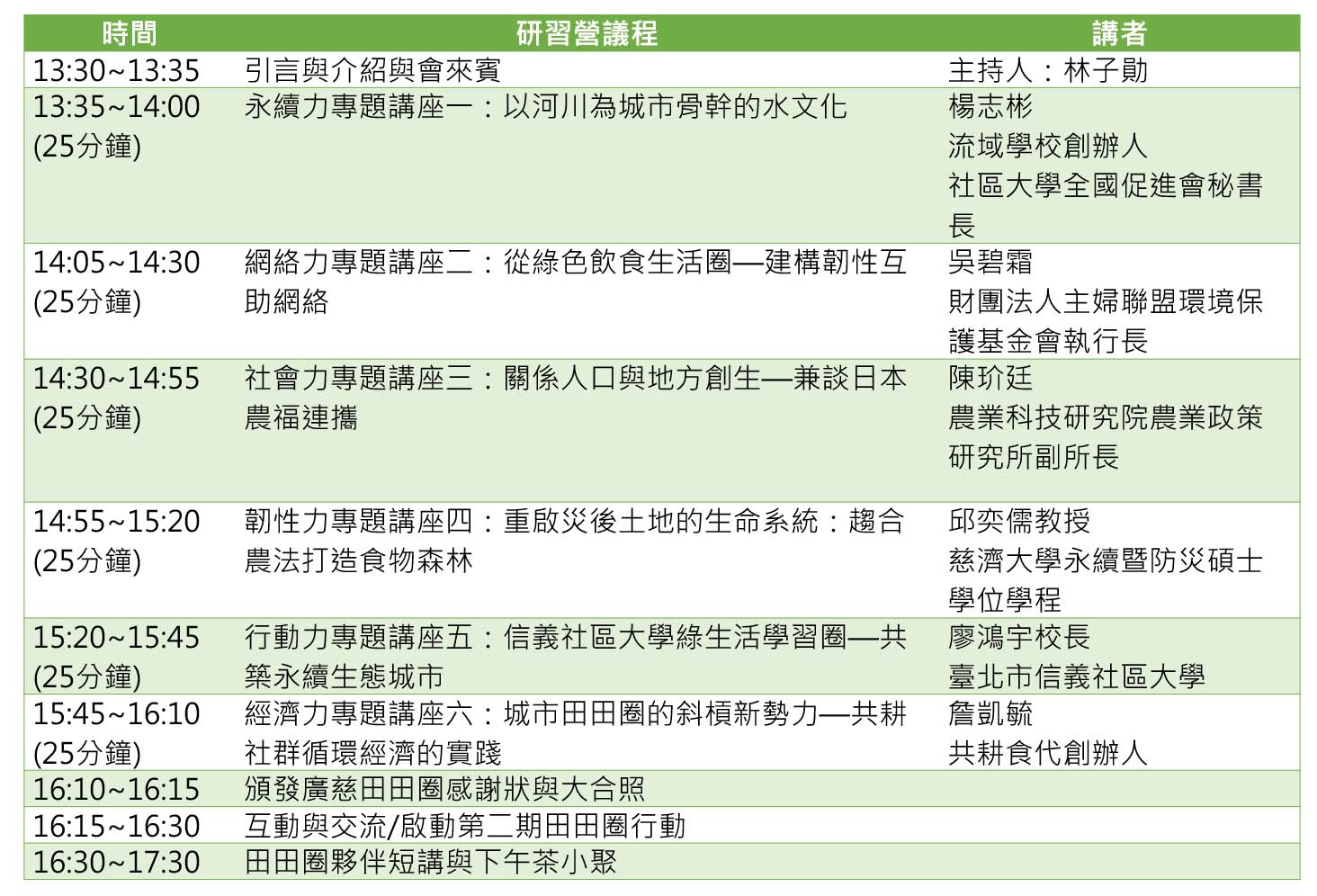 歡迎對『都市農耕』、『食農教育』、『綠色照顧』、『韌性城鄉』、『環境永續』、『零工合作經濟』議題有興趣的夥伴與朋友及一般民眾皆可免費報名。