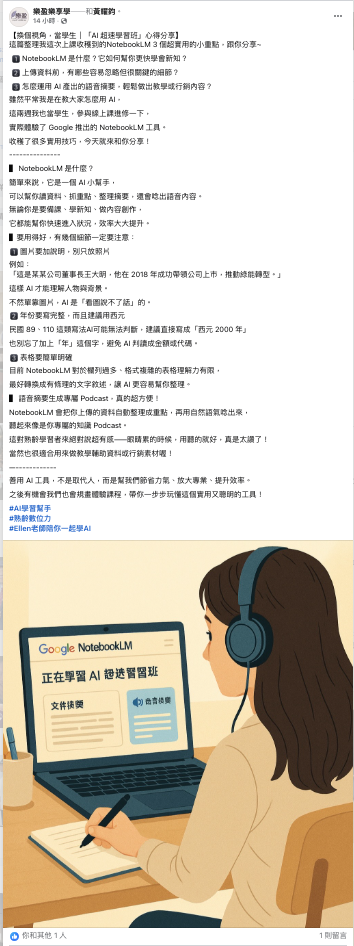 3.輕鬆有趣方式學習新知識:對於想學習的領域,可以先蒐集好資料,上傳NotebookLM,讓它生成知識型 Podcast,讓你得以輕鬆理解關鍵知識。