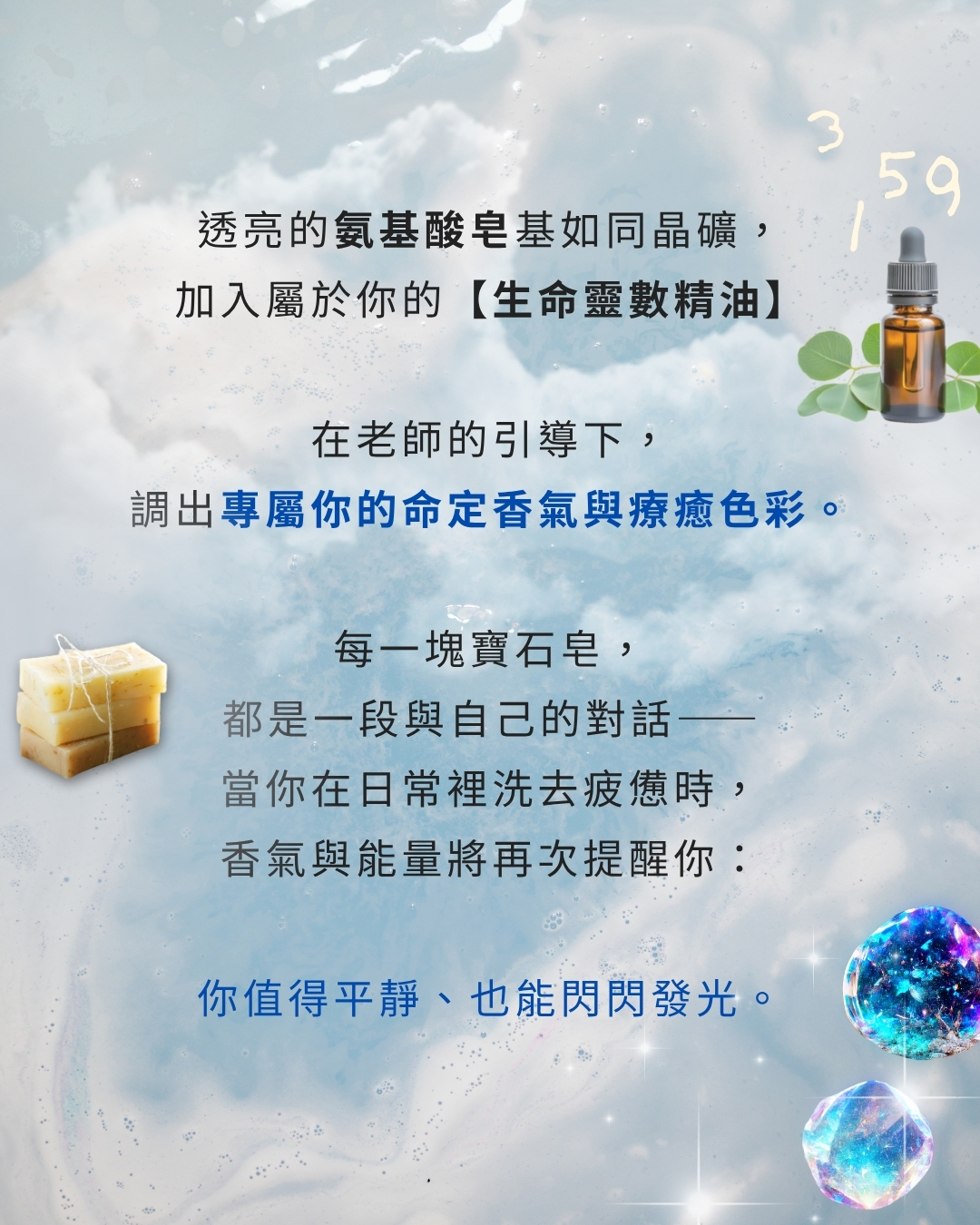 透亮的氨基酸皂基如同晶礦,加入屬於你的【生命靈數精油】