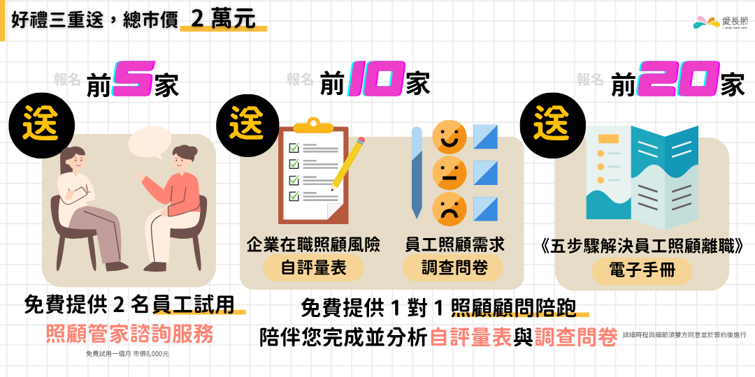 免費體驗《照顧管家諮詢服務》2 名員工名額(一人4次、總值 NT$8,000)2️⃣ 前 10 家報名企業