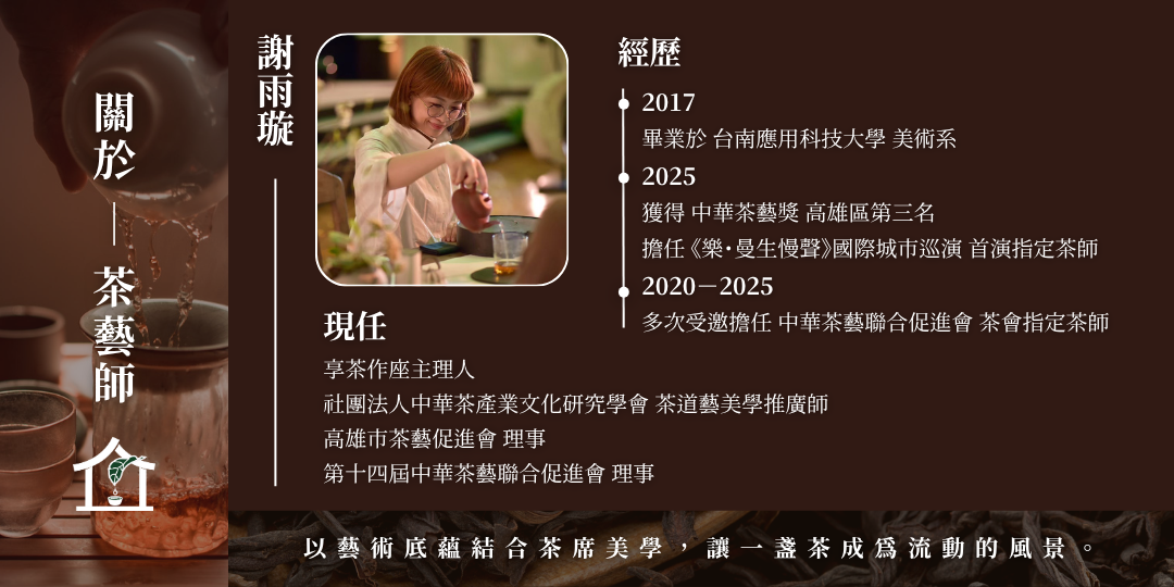曾於國際巡演《樂・曼生慢聲》中擔任首演指定茶師,以優雅姿態與柔和手法,讓茶香與音樂共舞。