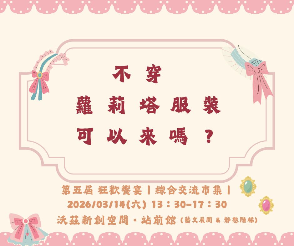 蘿莉塔時尚(Lolita Fashion)是一種穿搭風格, 而我們將不定期舉辦蘿莉塔時尚交流市集活動, 希望能透過各式各樣的交流市集,讓更多人了解蘿莉塔時尚。