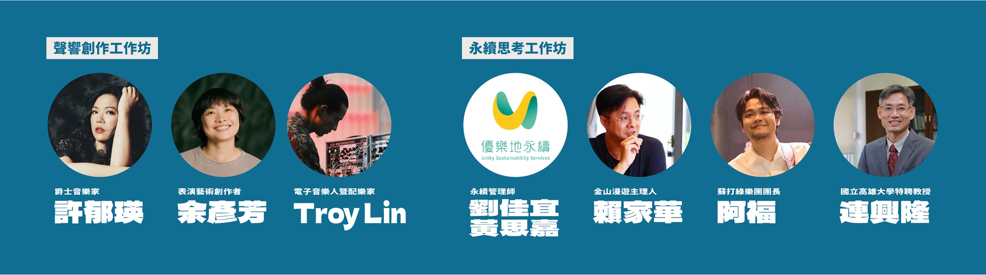 《RE: SOUND|聽見永續的回聲—聲響創作 × 永續思考工作坊》邀請到知名金曲樂團蘇打綠團長與吉他手阿福、爵士音樂家許郁瑛、表演藝術創作者余彥芳、電子音樂人與配樂家Troy Lin,還有永續行動者、地方實踐者與氣候大使,透過聲響創作、身體聲音、桌遊模擬、永續講座與氣候工具體驗,陪你一起探索,讓聲音走進日常,成為改變世界的力量。