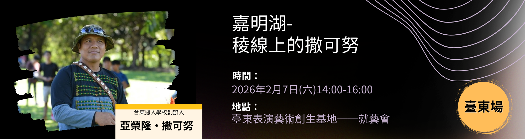 系列講座分為臺北場次、臺東場次,地點分別為『臺北捷運大安森林公園站-陽光大廳』及『臺東表演藝術創生基地──就藝會』,現場同時舉辦有《手作築砌.步履山林:嘉明湖手作步道十週年》策展,歡迎民眾講座結束後前往參觀。