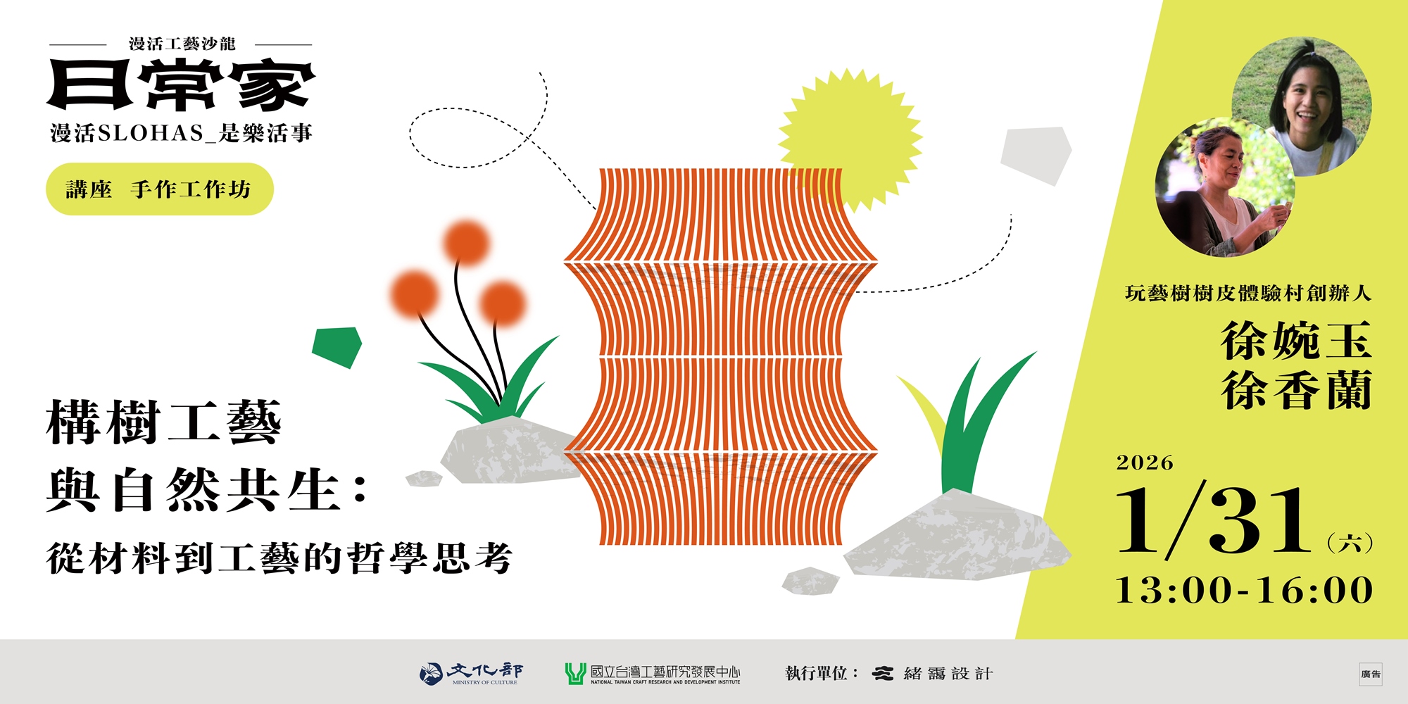 從工藝實踐者的投入歷程出發,走進樹皮工藝所承載的文化背景與產業脈絡,理解材料如何在當代被重新觀看與使用。透過講座分享,帶領參與者認識構樹樹皮在生活、文化與創作中的角色,並進一步走入實作體驗製作杯墊。