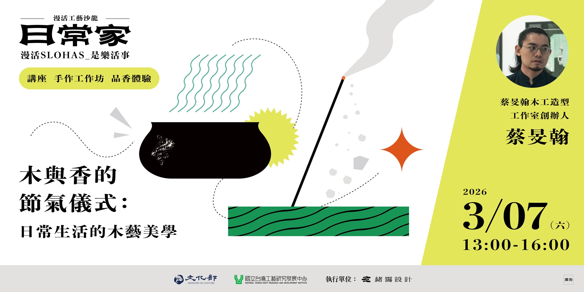 由在地青年工藝品牌創辦人,分享自身創作經驗。透過實木線香座的製作,體驗砂磨與雕刻等細木工技法,在操作中感受材料的質地變化。後段介紹香品使用與作品保養,透過交流分享,讓完成的器物回到生活之中,成為可被持續使用的日常物件。