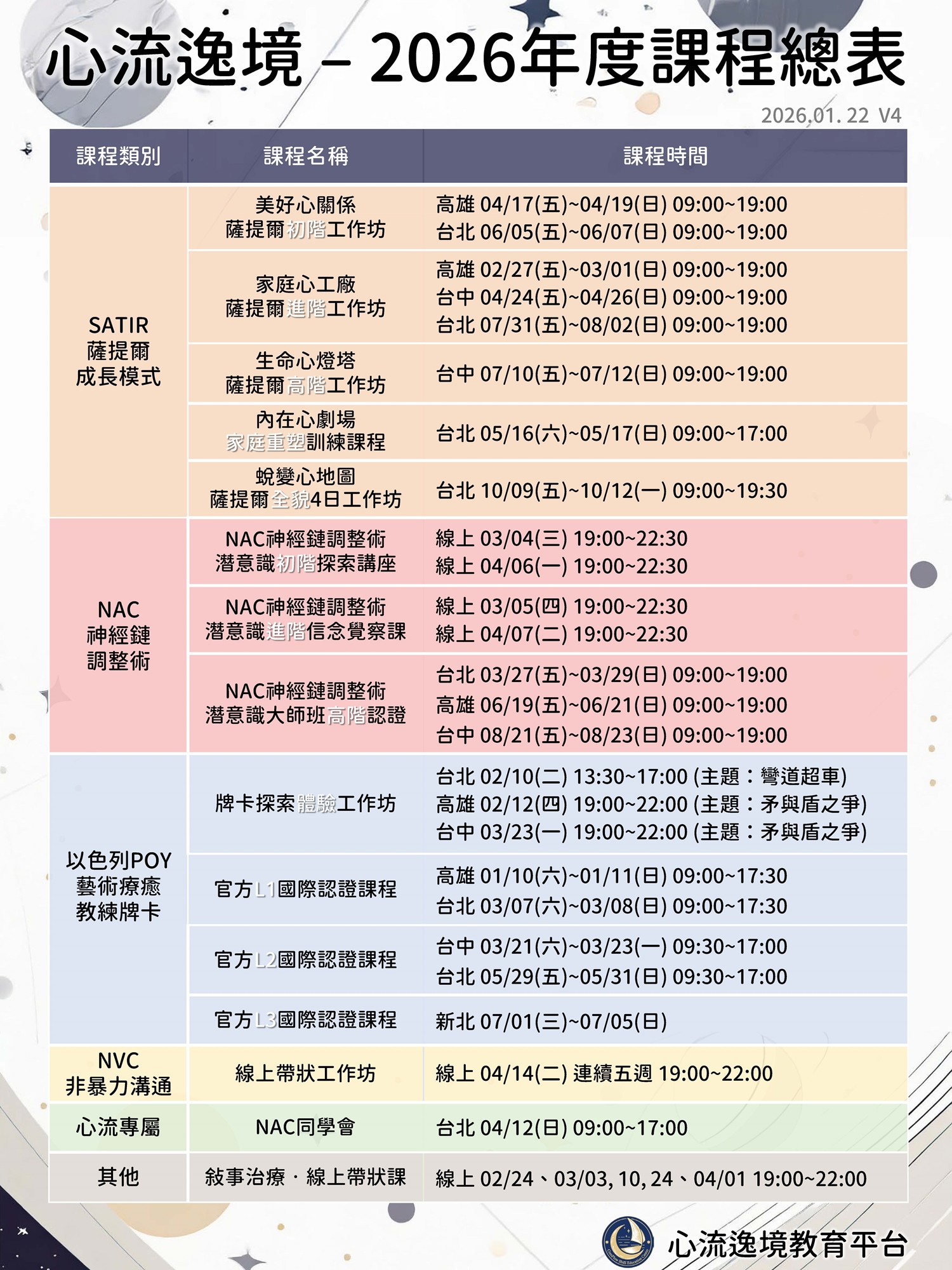 每週於台北、台中及高雄等城市巡迴開課