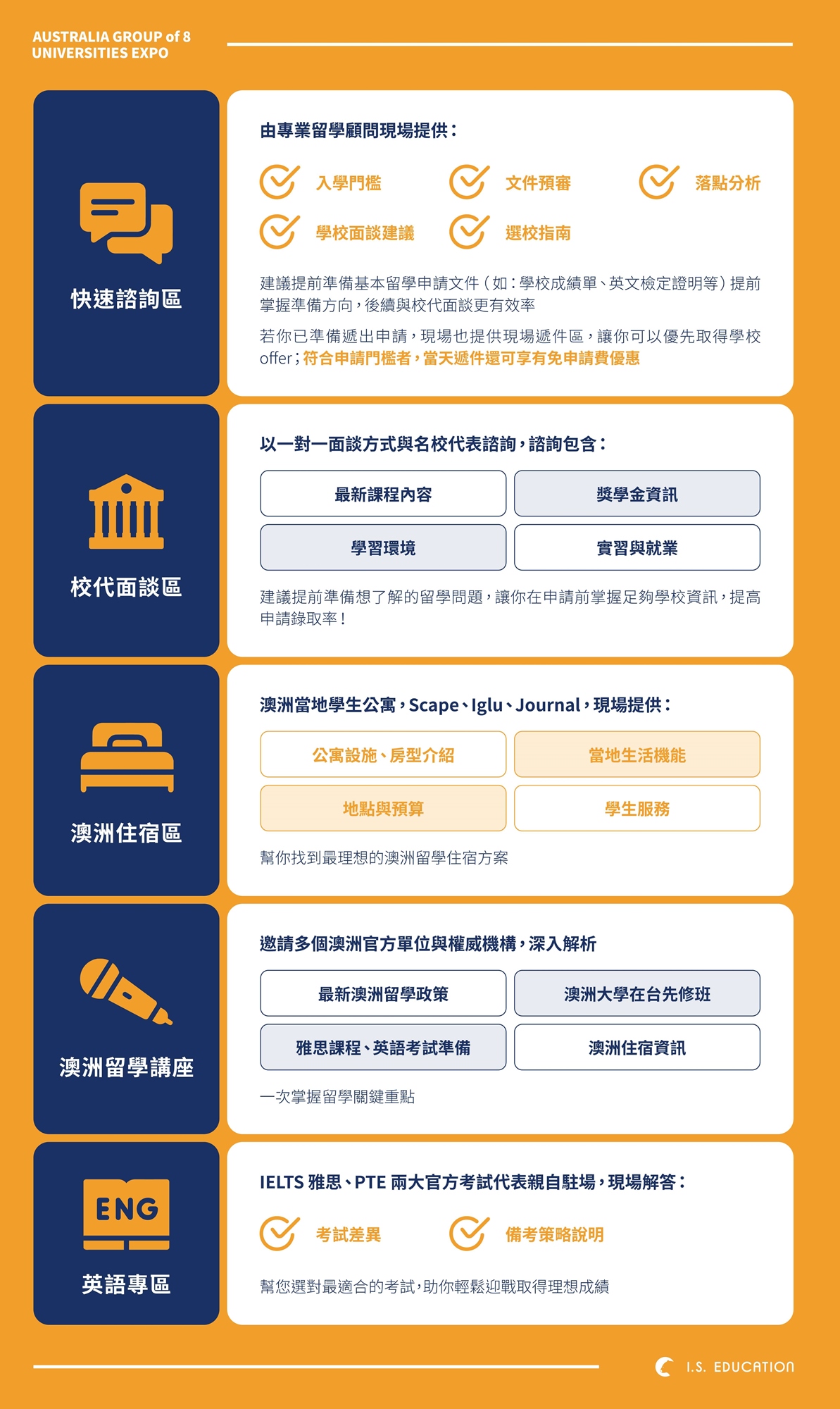 與澳洲名校面談、快速諮詢、現場遞交申請文件、英文考試準備、獎學金、當地住宿