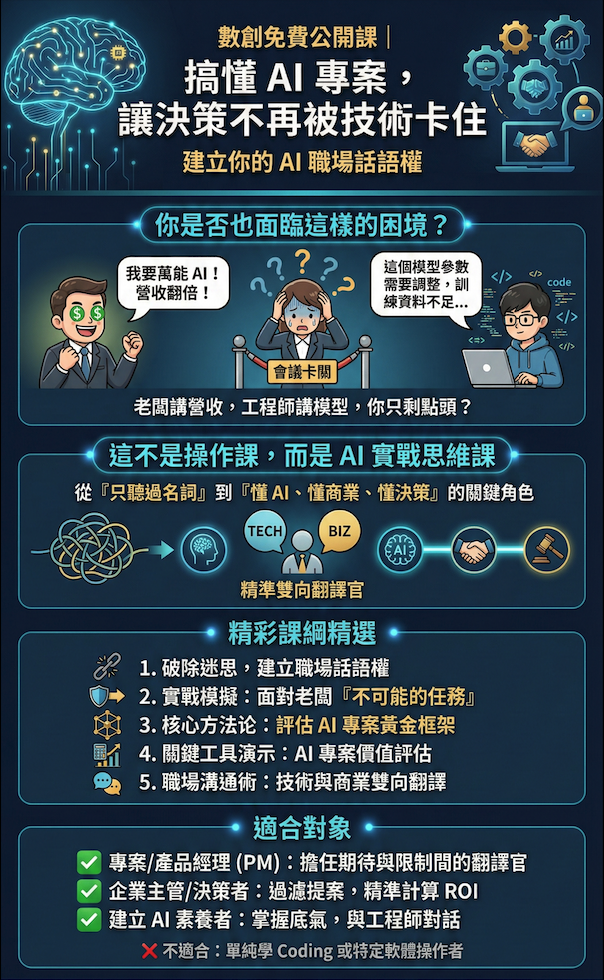 在 AI 浪潮下,許多企業面臨著相同的困境:老闆想做「萬能 AI」,工程師講著聽不懂的「模型術語」,而身為 PM 或中階主管的你,夾在中間不知該如何是好。