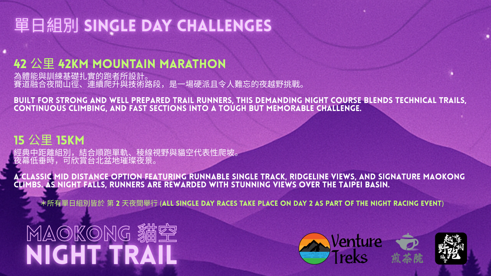 In 2026, the Maokong Night Trail officially expands into a two day trail running event, introducing a day race and night race format for stage race participants, deeper challenges for experienced runners, and an immersive after dark adventure on Day 2 for all single day categories.