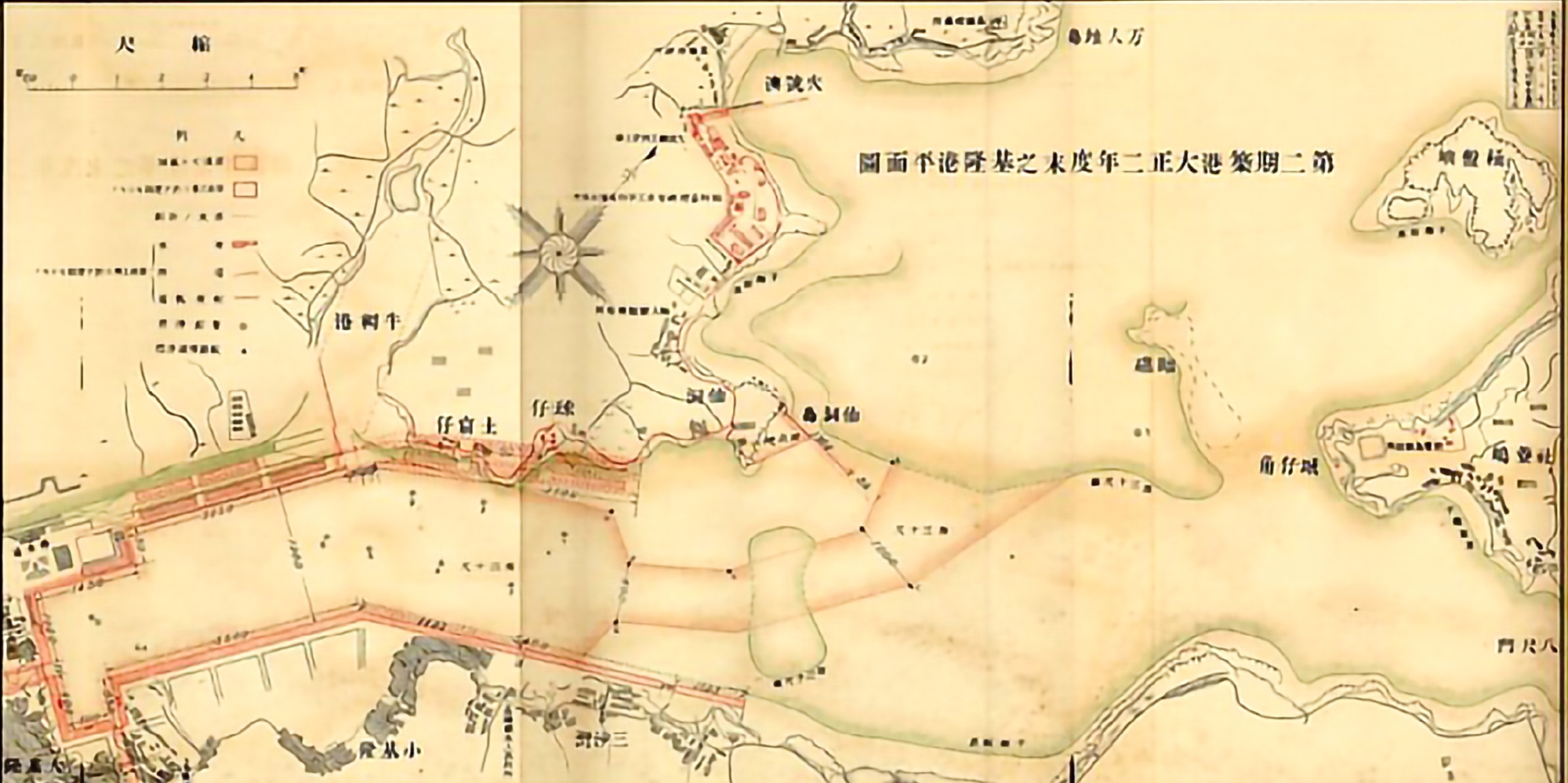 1906年第二期基隆港築港工程之平面圖。圖片來源:基隆築港誌圖譜。臨時台灣總督府工事部編纂,1916年。(圖/國家圖書館館藏)