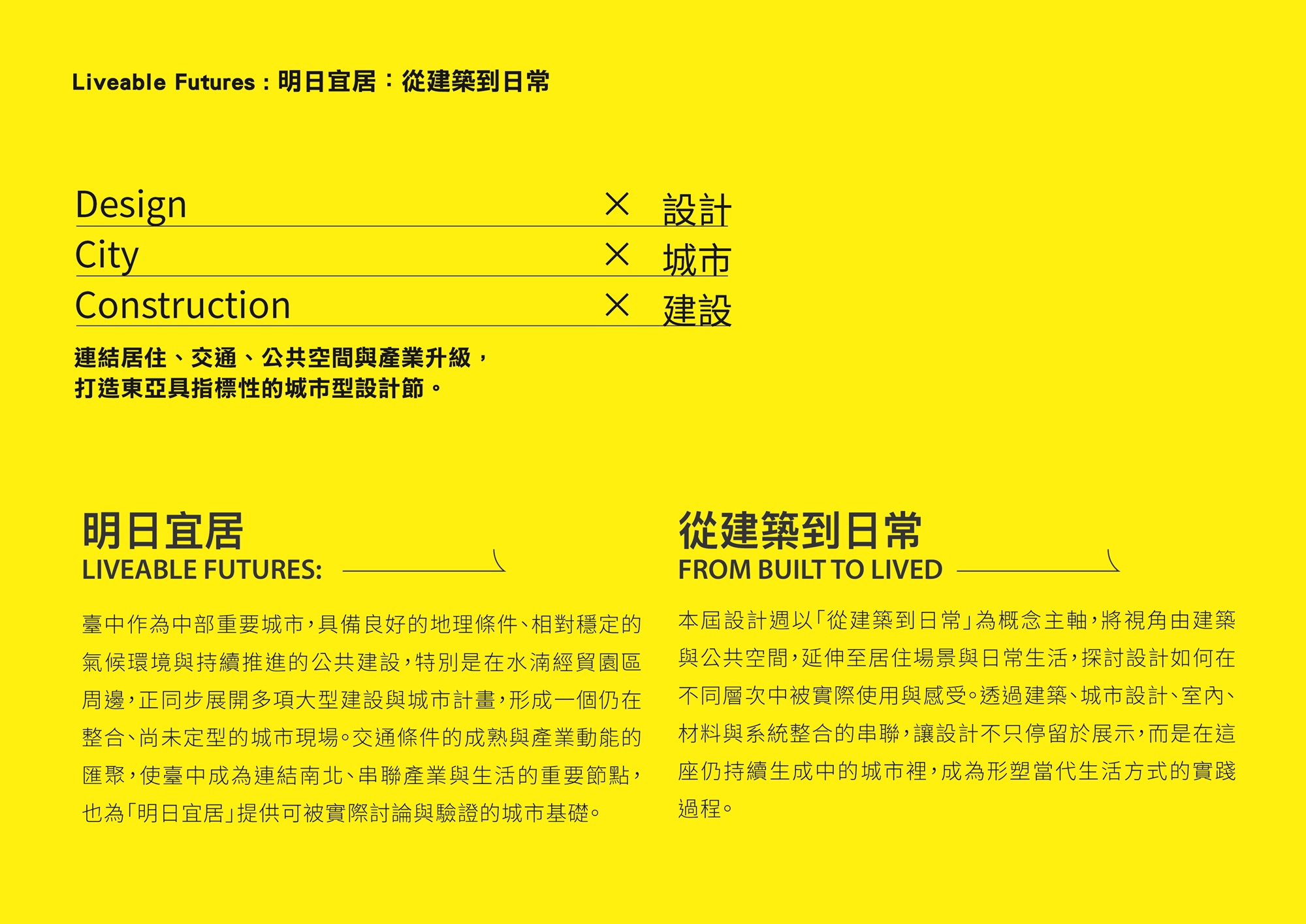 2026 台中設計週以「明日宜居:從建築到日常」為主題,聚焦建築、室內設計、建材設備、城市發展與生活美學,呈現設計如何回應未來居住與城市生活。活動將於臺中國際會展中心舉辦,透過展覽展示、專業論壇、主題講座、導覽參訪與產業交流,探討宜居城市、永續建築、低碳建材與智慧生活等關鍵議題,串聯設計專業與日常體驗,打造結合設計、產業與城市的整合平台。