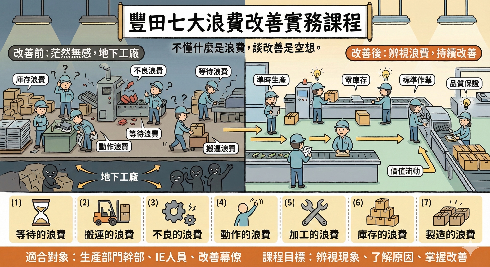 旨在系統化培訓管理幹部具備辨識「七大浪費」的能力。