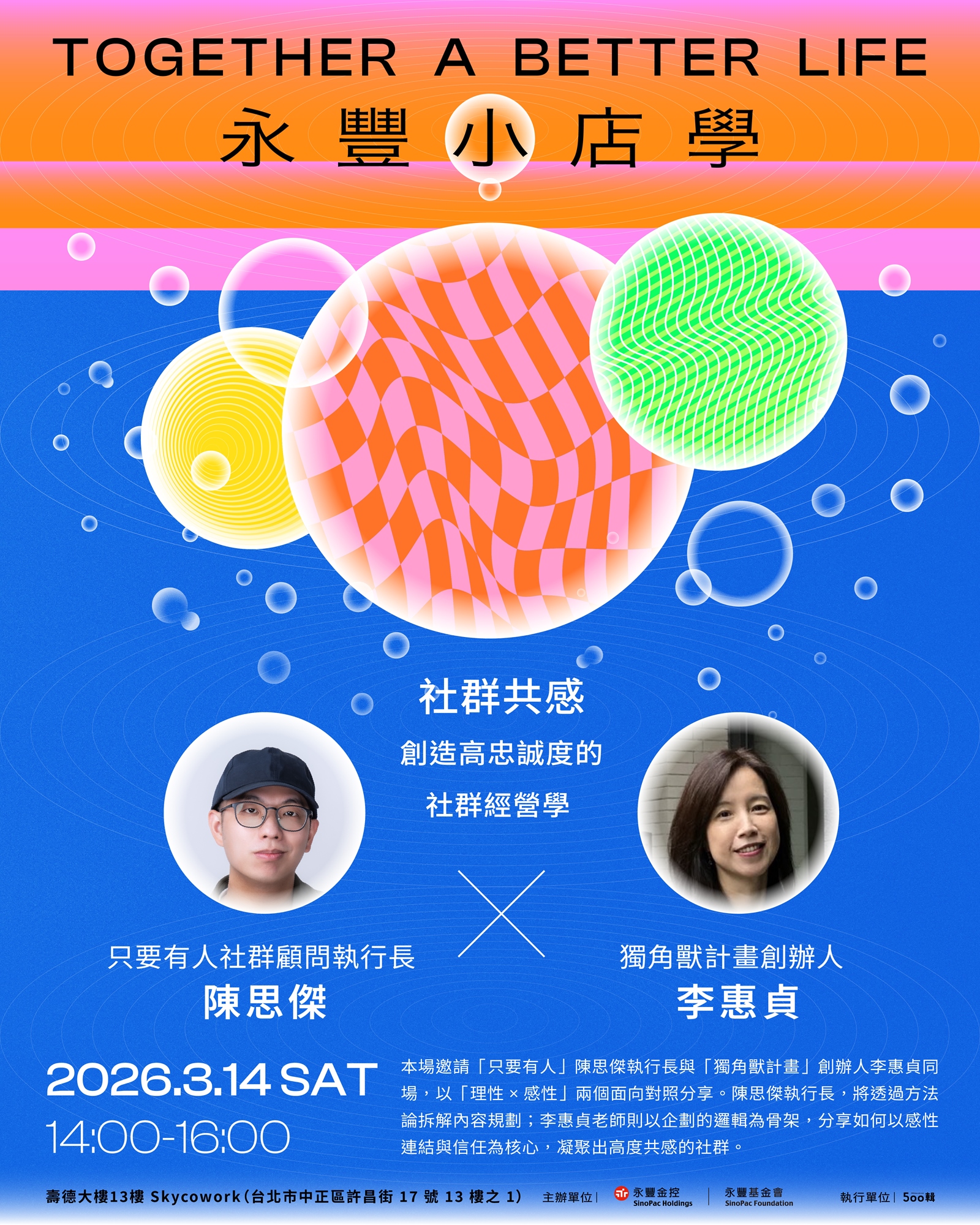小店雖小,只要巧用工具和方法,可以變得更聰明;可以借力使力,讓有意義的事情更有影響力。永豐小店學將透過大師課程的分享、場域實地參訪交流以及實作工作坊,為期一年的系列活動,讓小店永續力再升級!