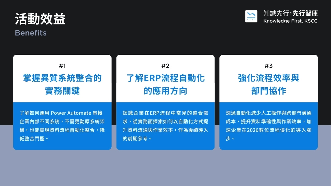 本次研討會將帶你認識如何透過 Power Automate 串接異質系統,打造ERP的自動化流程。不需改系統、不用寫程式,就能實現資料同步、跨工具整合,大幅降低手動處理時間與溝通成本。即使你是剛接觸自動化的初學者,也能透過本場分享掌握實務案例與整合趨勢,搶先卡位 2026 企業流程優化的自動化關鍵。