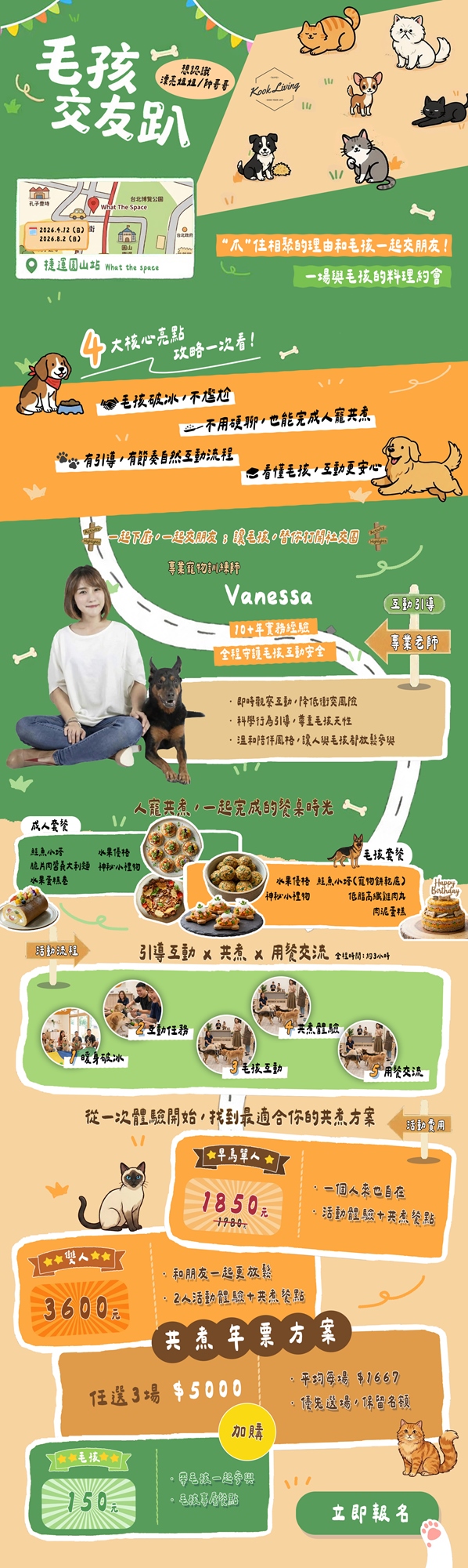 毛孩友善!讓毛孩找到喜歡的新朋友 人寵共煮!一次煮出狗狗與自己的料理 自然交流!最友善的毛孩,成為互動的橋樑 學習價值!學到和狗狗互動的小訣竅 不用擔心料理能力,現場有小老師教學, 更有神隊友一起合作,一起來玩吧!!!