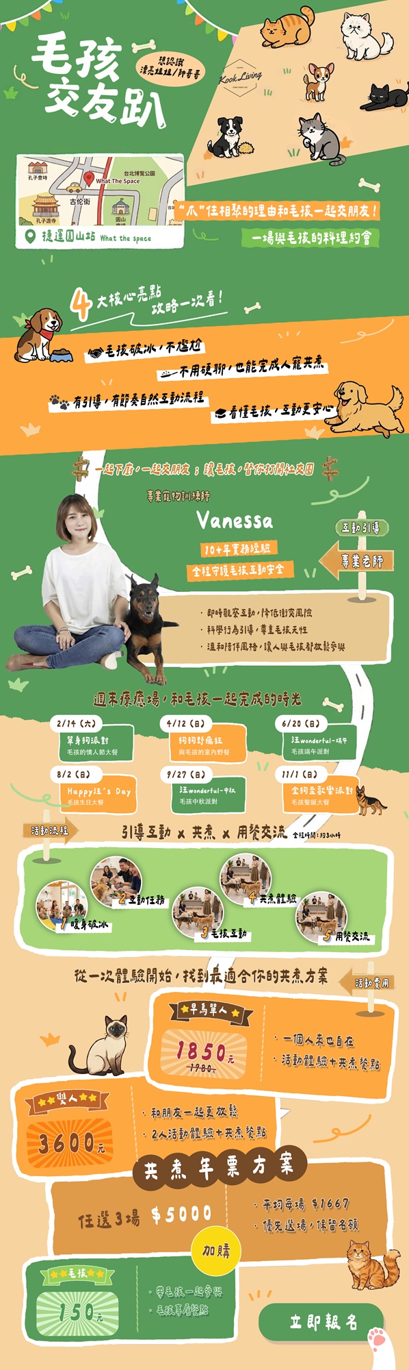 毛孩友善!讓毛孩找到喜歡的新朋友 人寵共煮!一次煮出狗狗與自己的料理 自然交流!最友善的毛孩,成為互動的橋樑 學習價值!學到和狗狗互動的小訣竅 不用擔心料理能力,現場有小老師教學, 更有神隊友一起合作,一起來玩吧!!!