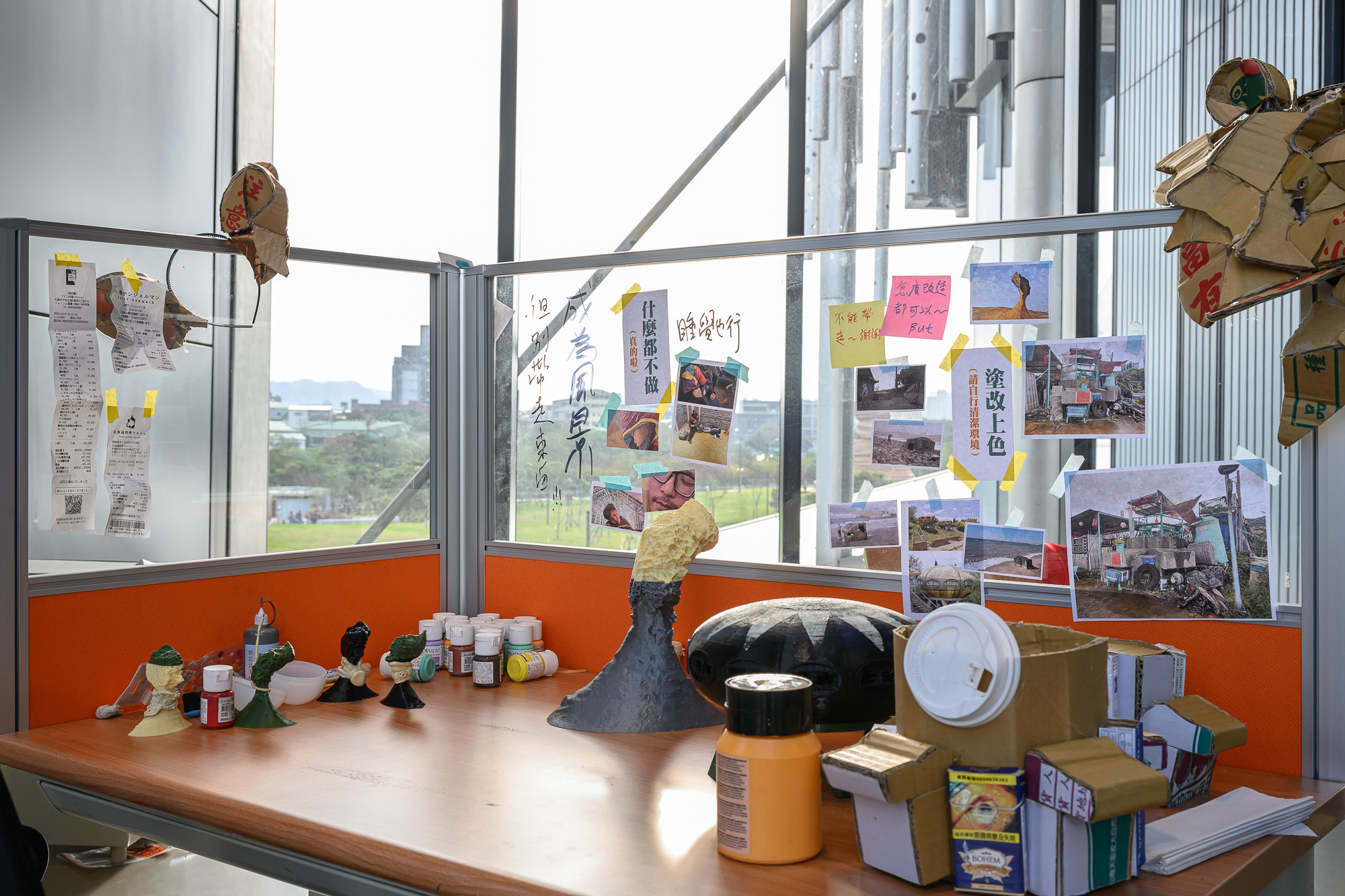 〈準時下班〉為「如果這都不算Ai,我有什麼好Bi?」展覽的作品之一,藝術家以美術館庫房裡的辦公桌為創作靈感,於公共空間中設置工作空間,邀請參與者使用現場材料進行創作;這些產出隨即轉化為本展4A展間外作品〈販賣機〉裡可被購買的紀念品。在此生產過程中,藝術家改變了觀眾與作品間的關係;當觀眾花錢買下他人勞動的創作成果時,所獲得的究竟是種美好的「紀念」抑或是集結的「怨念」,往往僅有一線之隔。