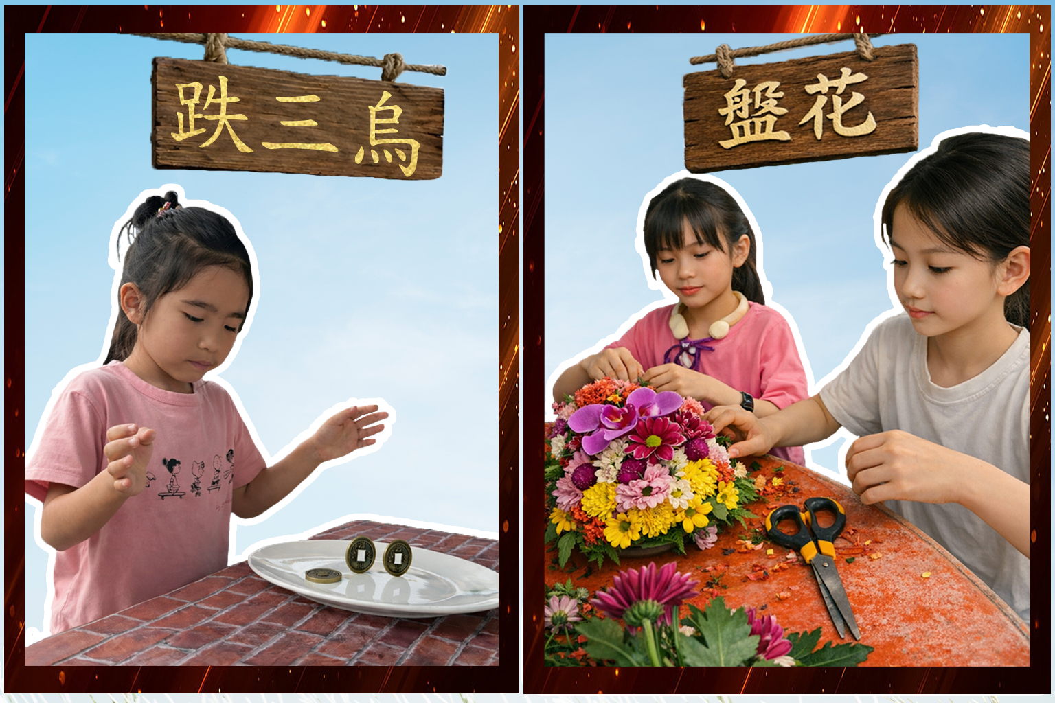 「跌三烏」為客家春節遊戲,將三枚銅錢拋入盤中並喊「三烏哦」,若皆為烏面朝上即勝利。屏東六堆客家祭俗「盤花」以庭院花卉洗淨層疊於盤,象徵敬神祭祖、圓滿與勤儉,讓參與者體驗。