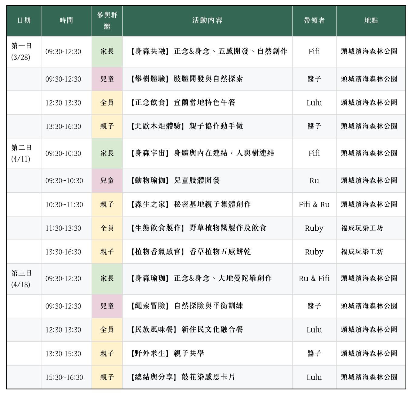 - 安全優先:森林很溫柔,但它畢竟是戶外,我們會把每一步都放在「安全、舒服、可被照顧」的節奏裡。