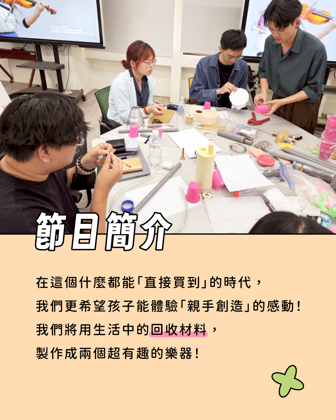 在這個什麼都能「直接買到」的時代,我們更希望孩子能體驗「親手創造」的感動。透過動手做樂器,親子一起發現:原來生活中的回收材料,也能變成會唱歌的寶物。
