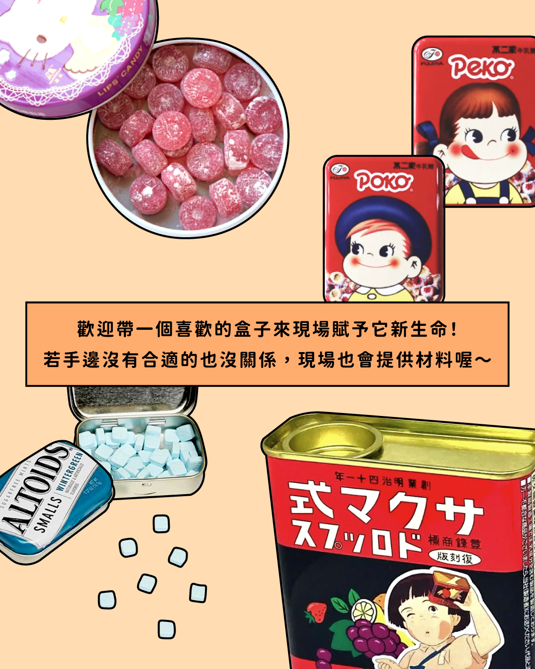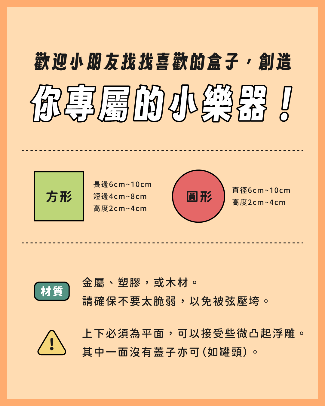 ・歡迎小朋友找找喜歡的盒子來創造你專屬的小樂器!