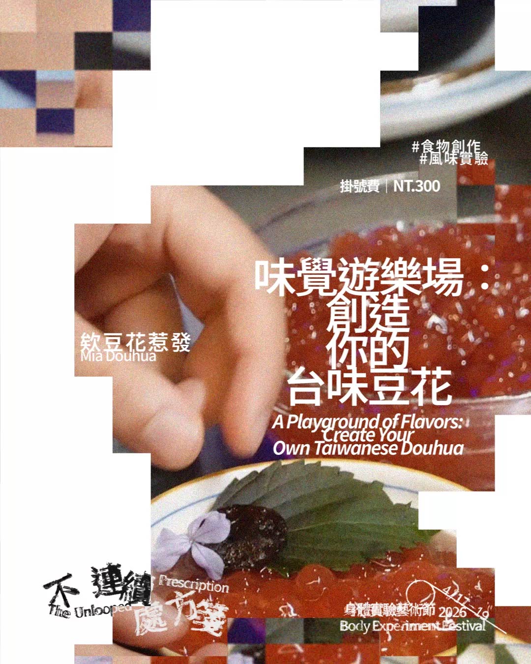 你將在味覺遊樂場中,利用在地的乾貨、醬料、甚至中藥材進行風味實驗,設計出一碗對自己具有特殊意義、重組記憶與感官的台味豆花 ,邀請你帶著好奇心,在味覺的遊樂場裡,以食材為點、記憶為線,重新定義你的台味驚喜