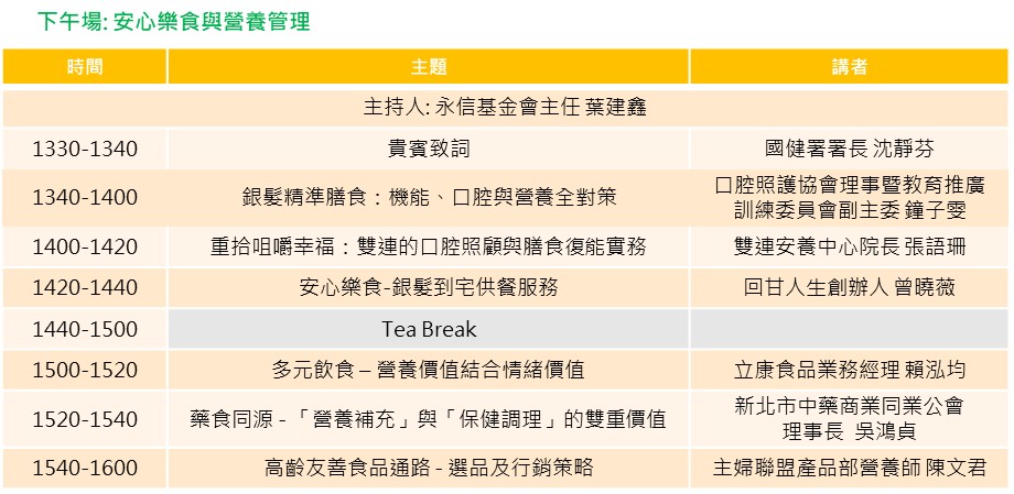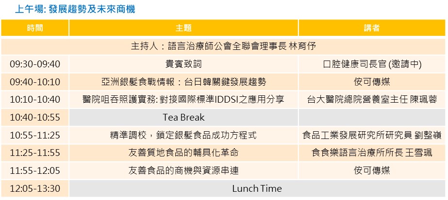 協辦單位 │ 中華民國牙體技術師公會全國聯合會、中華民國語言治療師公會全聯會、中華民國學名藥協會、中華民國營養師公會全國聯合會、台北市社區銀髮族長期照顧發展協會、台灣生技產業聯盟、台灣由口進食協會、台灣咀嚼吞嚥障礙醫學學會、台灣居家服務策略聯盟、台灣長期照顧發展協會全聯會、台灣長照社團法人協會、台灣保健營養食品工業同業公會、台灣銀髮產業協會、食品工業發展研究所、桃園市長期照護體系協會、新北市長期照護發展協會、新北市糕餅商業同業公會、臺灣護理之家協會、質地友善食品產業聯盟 (TAF)