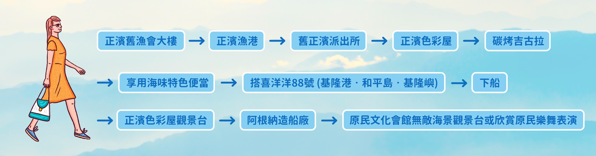 正濱舊漁會大樓 → 正濱漁港 → 舊正濱派出所 → 正濱色彩屋 → 碳烤吉古拉 → 享用海味特色便當 →「搭喜洋洋88號」海上遊程→ 正濱色彩屋觀景台 → 阿根納造船廠 →原民文化會館無敵海景觀景台或欣賞原民樂舞表演