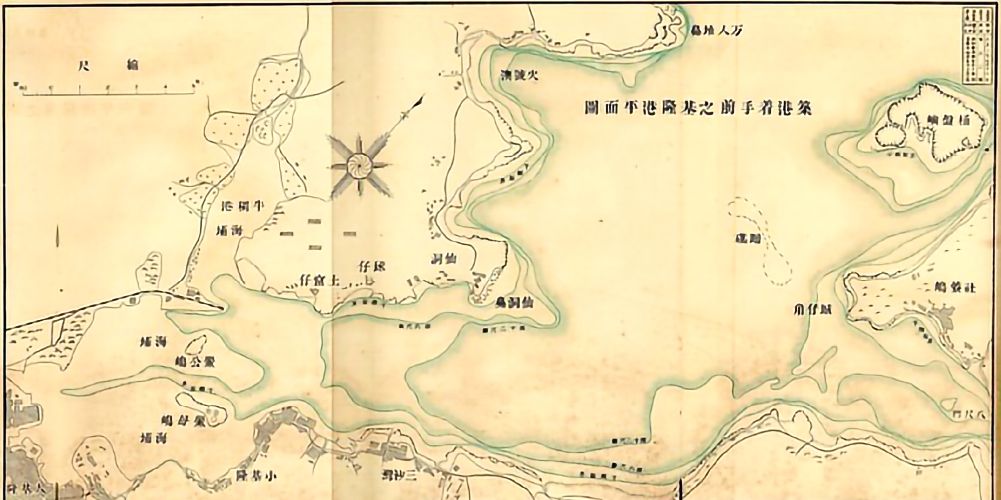 1899年第一期基隆港築港之前之平面圖。圖片來源:基隆築港誌圖譜。臨時台灣總督府工事部編纂,1916年。(圖/國家圖書館館藏)