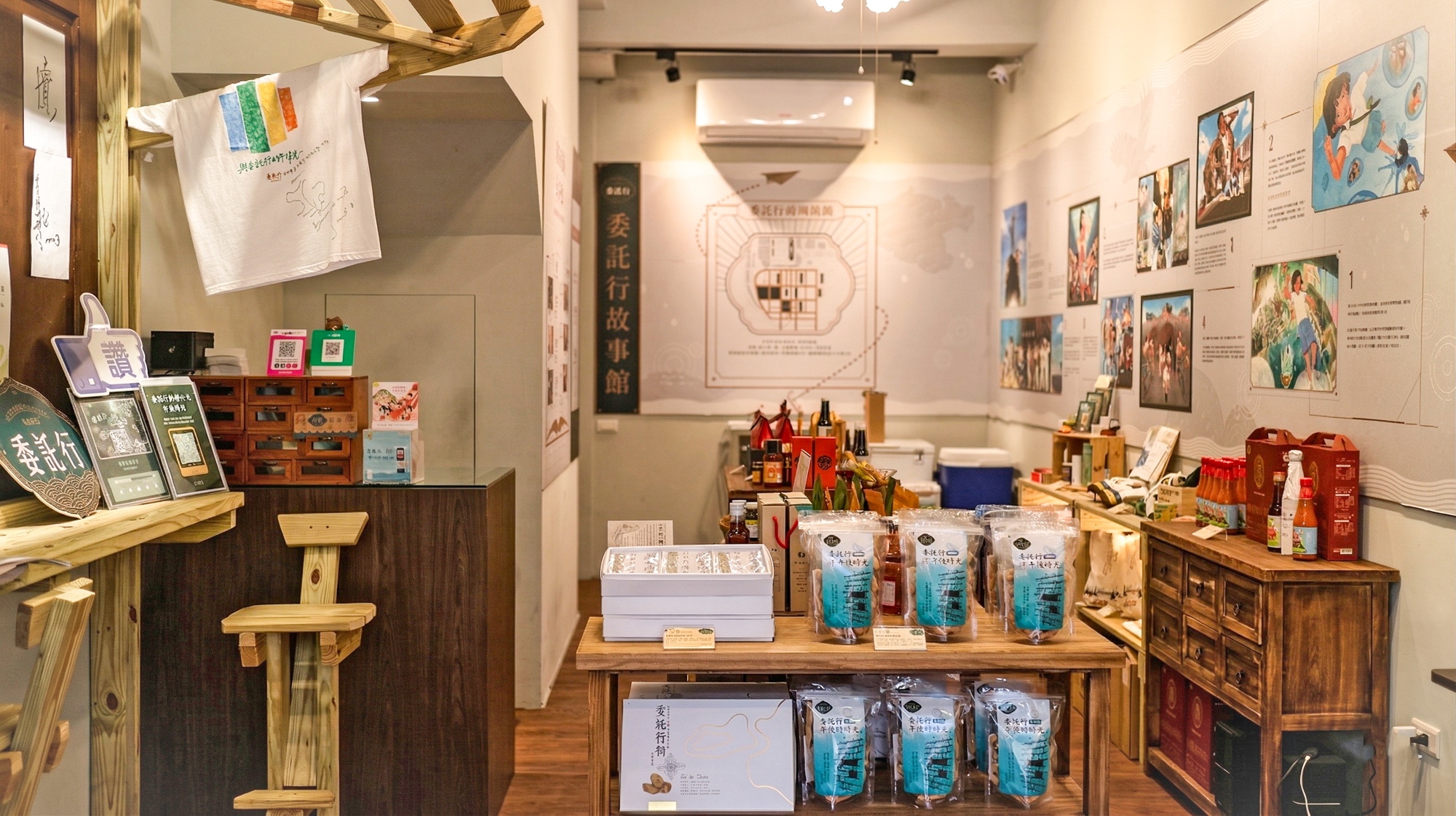 福氣委託行故事館就在委託行街區商圈裡,共有二層樓。一樓右側牆面是由坎城創意節設計師李沁精心繪製,以時下流行的穿越故事進行包裝,讓人輕鬆了解委託行街區的過往歷史與演變。店中除了有多款基隆在地的文創商品外,也有許多基隆在地小農自行開發的產品。