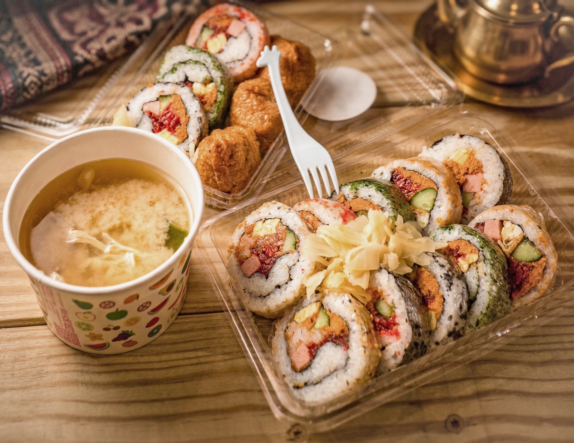 特別與委託行街區的蓉記壽司合作,提供當天現做的花壽司或豆皮壽司,也有熱呼呼的味噌湯。
