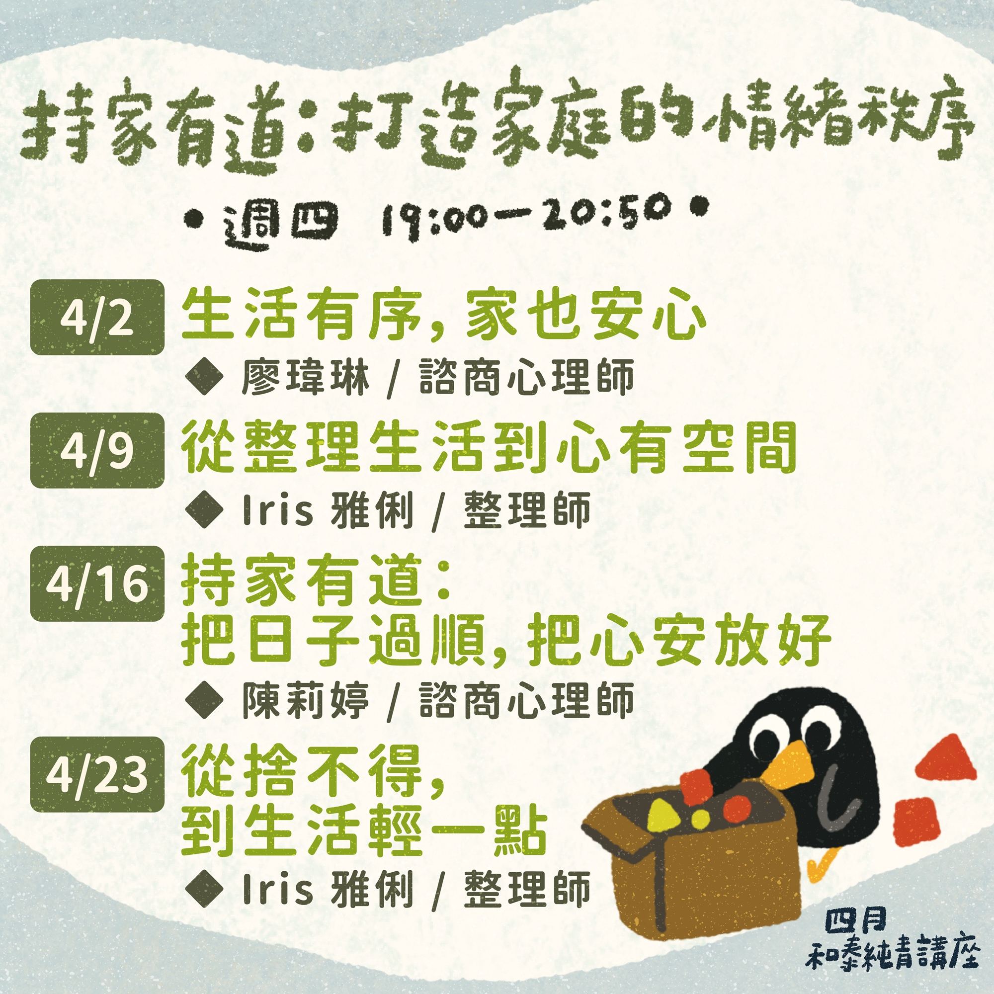 四月週四 19:00-20:50 以家庭為主題的講座