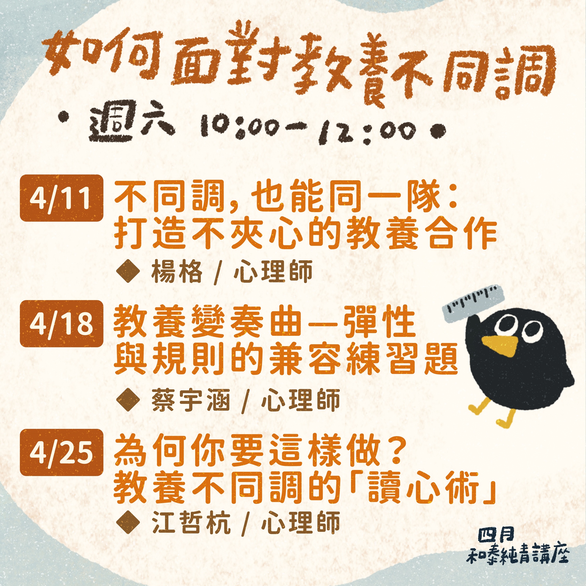 四月週六 10:00-12:00 以親職教養為主題的講座