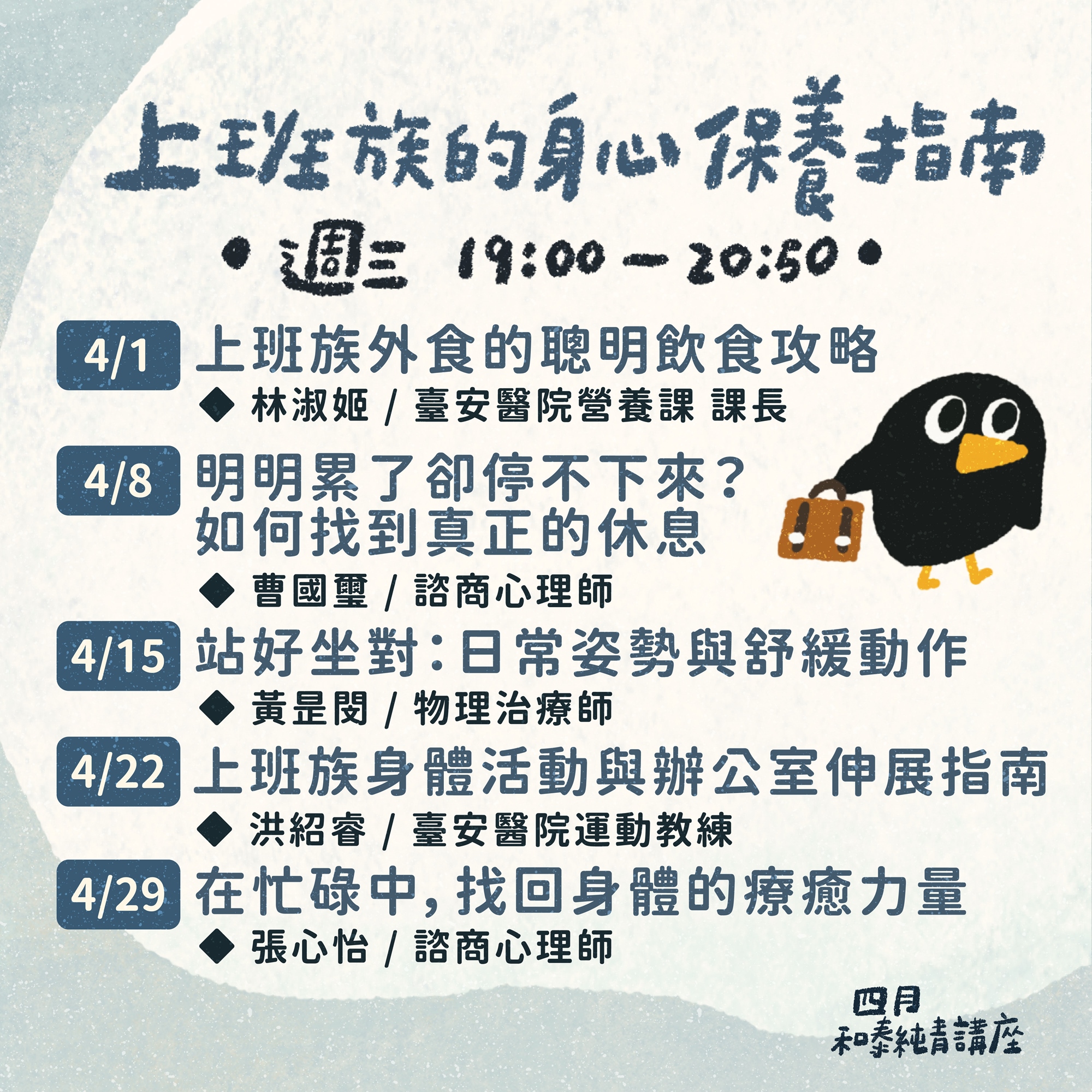 四月週三 19:00-20:50 以職場為主題的講座