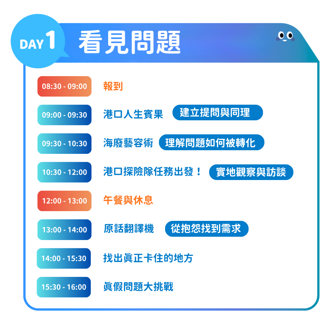 💡 史丹佛設計思考實戰: 歷經「同理、定義、發想、原型、測試」五大步驟,將聽到的在地痛點,轉換為看得見、摸得到的創意解方。