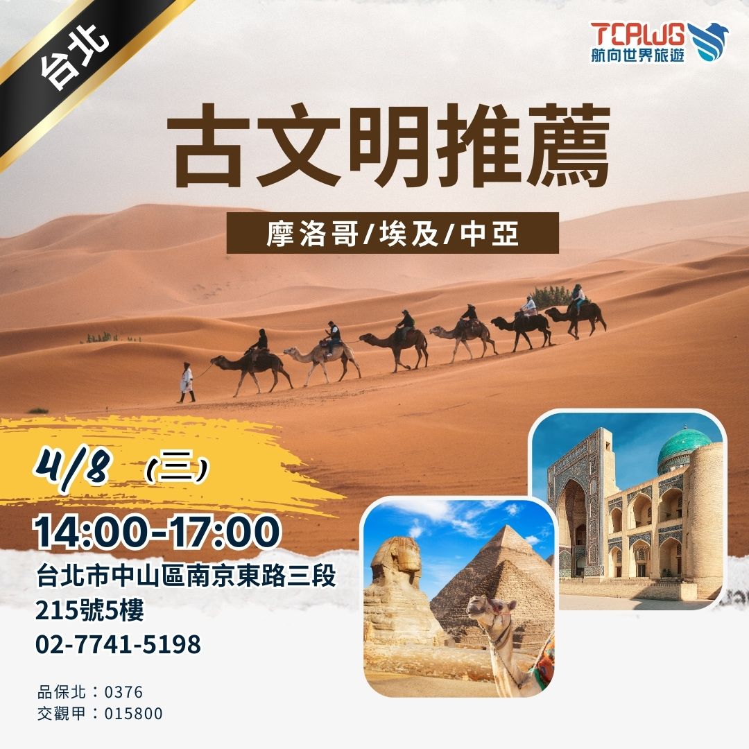 - 講座重點搶先看: 現場將介紹 摩洛哥 古城與沙漠、 埃及 金字塔文明、 中亞 絲綢之路古城, 帶你深入了解這條充滿歷史魅力的旅遊路線。