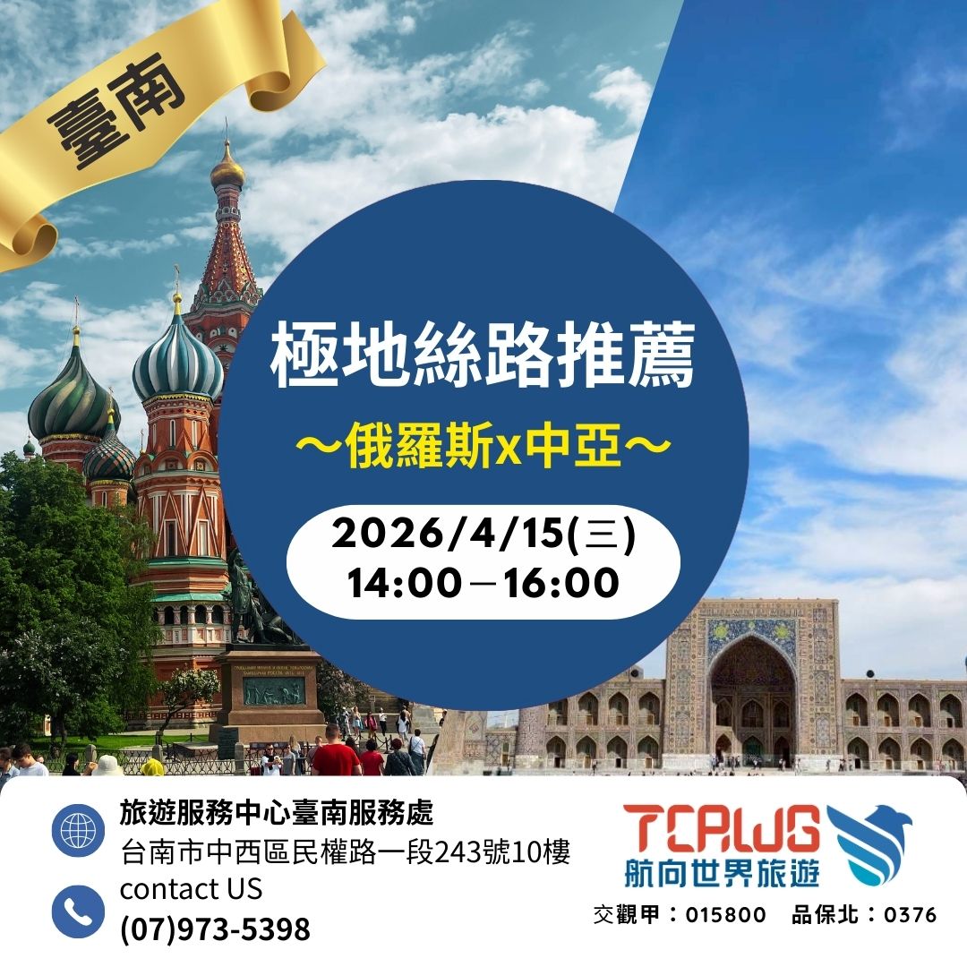 - 講座重點搶先看: 現場將介紹 俄羅斯 城市文化亮點、 中亞 絲綢之路古城、 最佳旅遊季節與行程規劃, 帶你了解這條充滿歷史故事的經典旅遊路線。