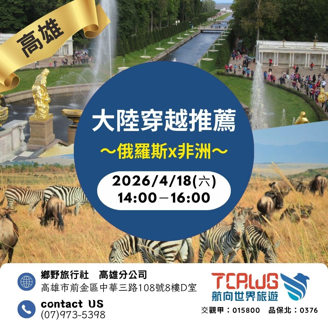 - 講座重點搶先看: 現場將介紹 俄羅斯 城市文化亮點、 非洲 野生動物與大遷徙、 最佳旅遊季節與行程安排, 幫助你了解這條壯闊的跨洲旅遊路線。