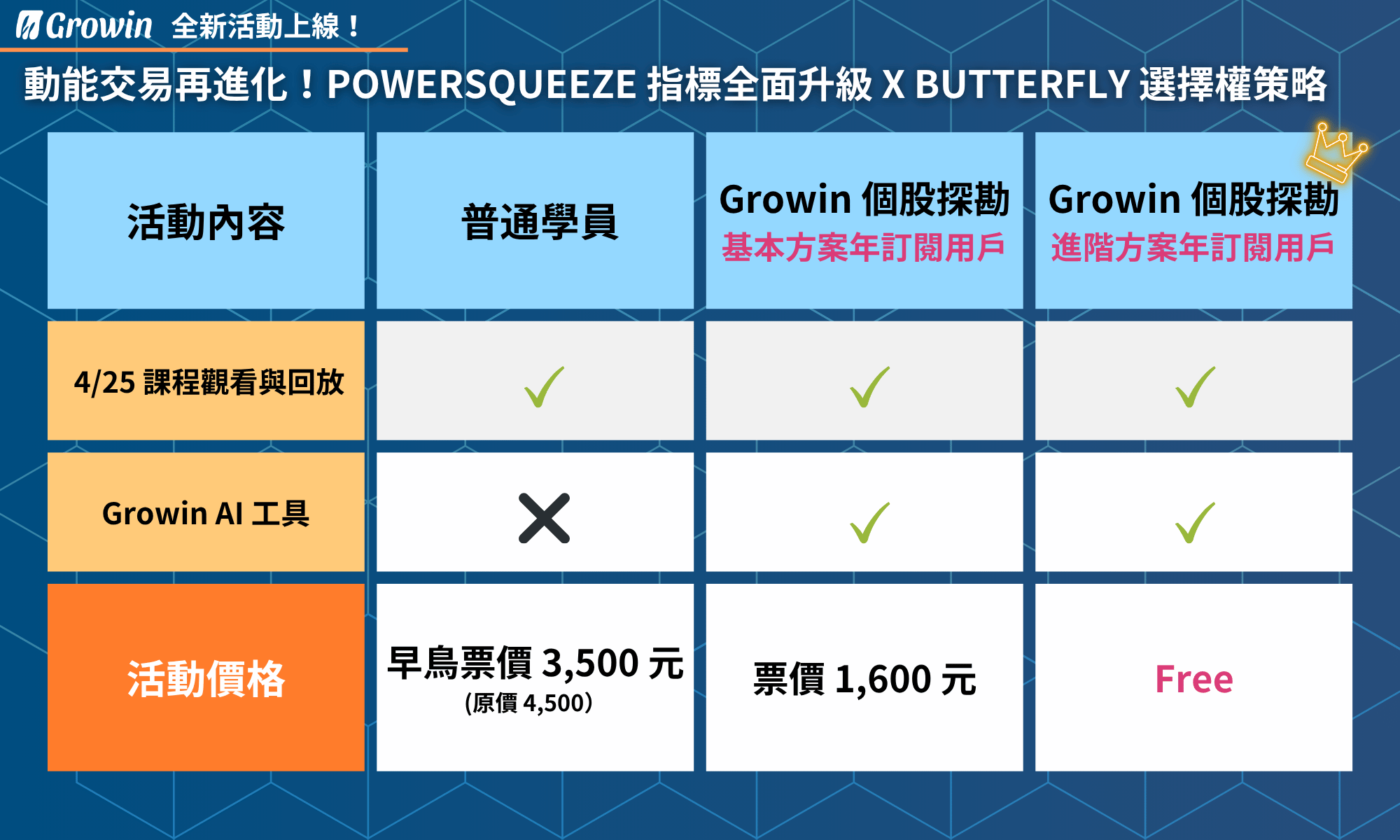搭配 Growin 獨家 AI 動能指標,打造一套更有紀律、更精準的選擇權交易系統。